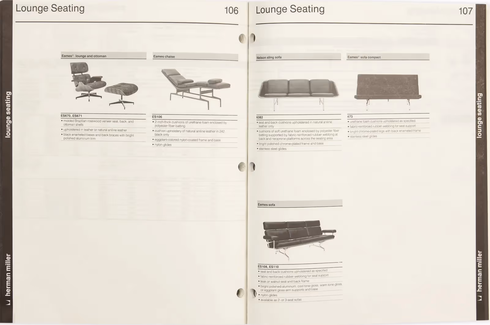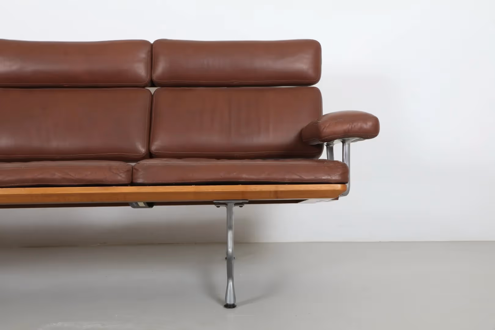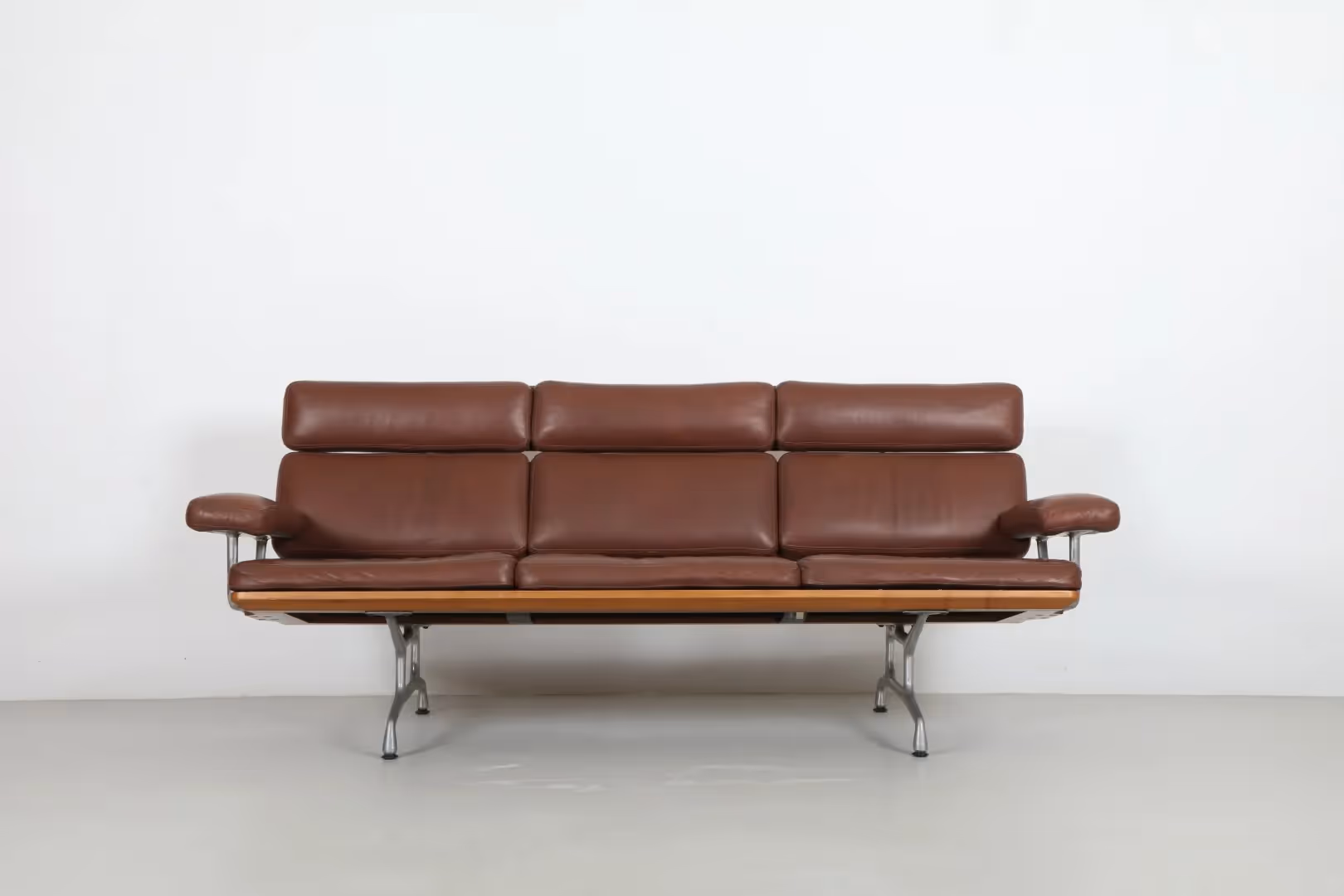 The ES108 sofa, also known as the Eames Sofa or Soft Pad Sofa, was the last furniture piece designed by the Eames Office, completed by Ray Eames after Charles Eames' death in 1978. It was initially conceived in the mid-1960s but production was delayed, finally entering the market in 1984 as part of the Aluminium Group series.