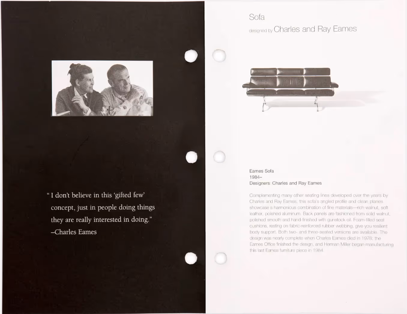 The couple is best known for their iconic furniture designs for Herman Miller, particularly the 1956 Eames Lounge Chair and Ottoman (Model 670 and 671), which has become a symbol of mid-century modern design. They embraced new materials and technologies, such as molded plywood and fiberglass, to create innovative and functional furniture pieces that were both aesthetically pleasing and comfortable.
