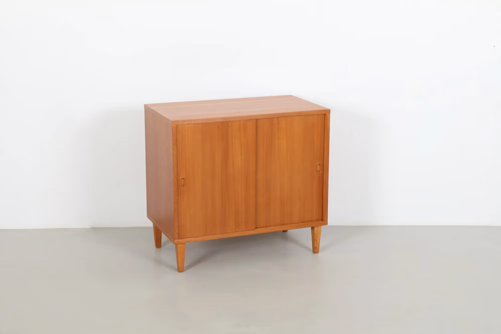 Greater success was quick to follow, in 1954 the String shelving system earned the couple an international design prize, a gold medal at the Milan Triennial. Today String shelving is a mid-century design icon and just as beautiful, functional and desirable as the day it was invented. This compact sideboard piece is a functional, standalone component of the design with teak construction and functional sliding doors.