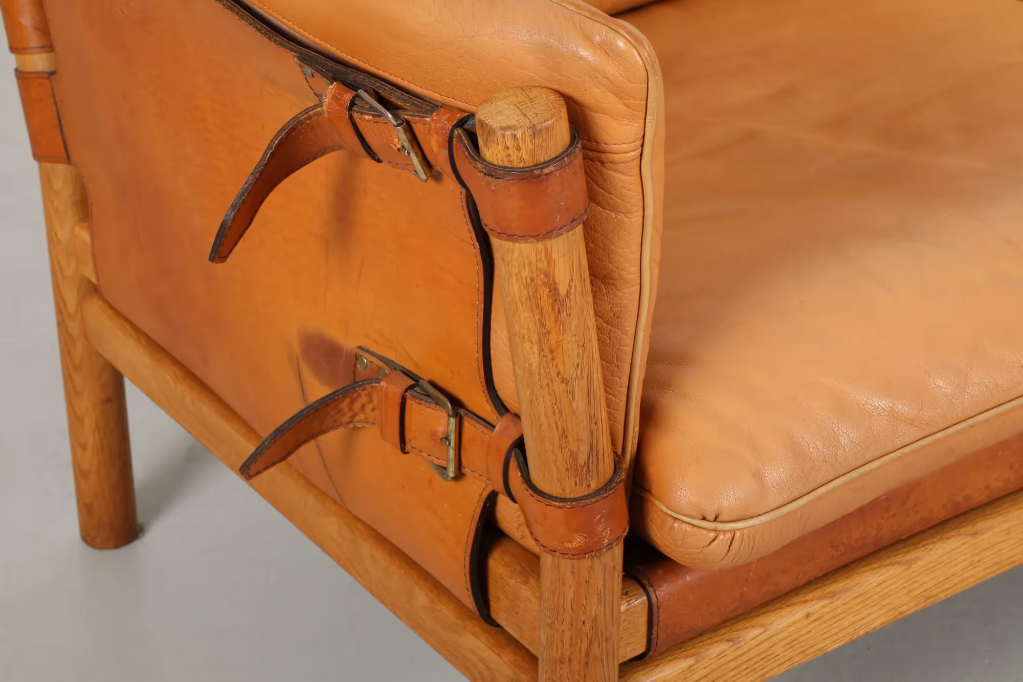 Deluxe Scandinavian three-seat leather sofa in the spirit of Arne Norell, pairing relaxed luxury with refined, architectural lines. Thick hide leather side and back supports are crafted with robust straps and metal buckles, lending tactile depth and a sling-style presence with subtle rustic character.
