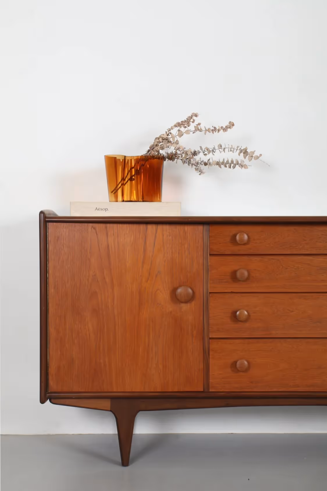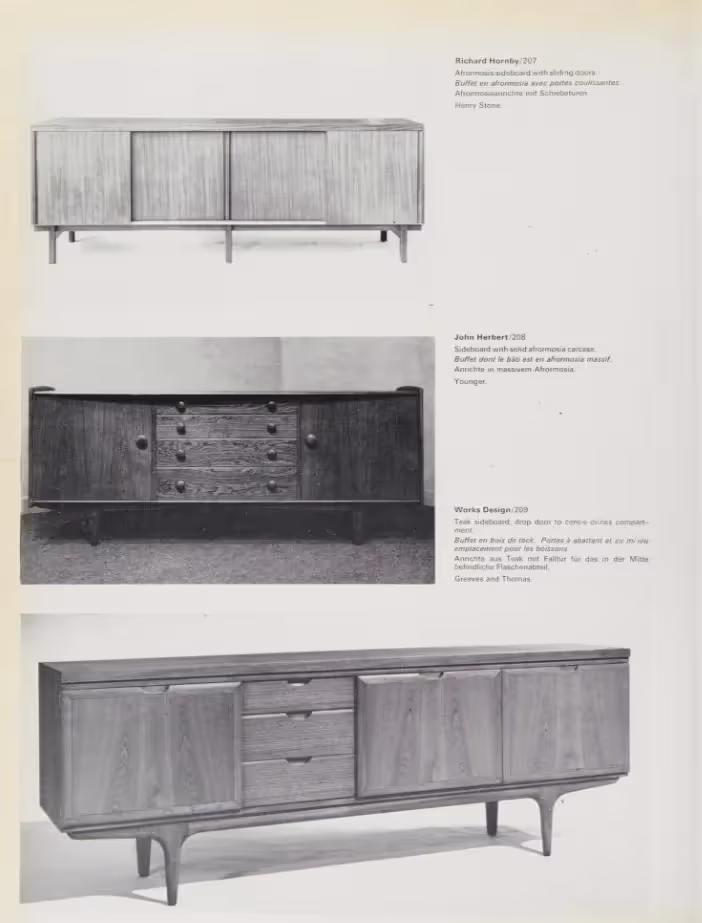 Younger Furniture satisfied the taste of discerning buyers during the 1950s, 60s and 70s. The company offered sophisticated, high-quality ranges of furniture that were always at the cutting edge of contemporary design. This memorable 'Volnay' sideboard from 1956 was designed by the talented John Herbert, it was very progressive and remained in production for a decade.