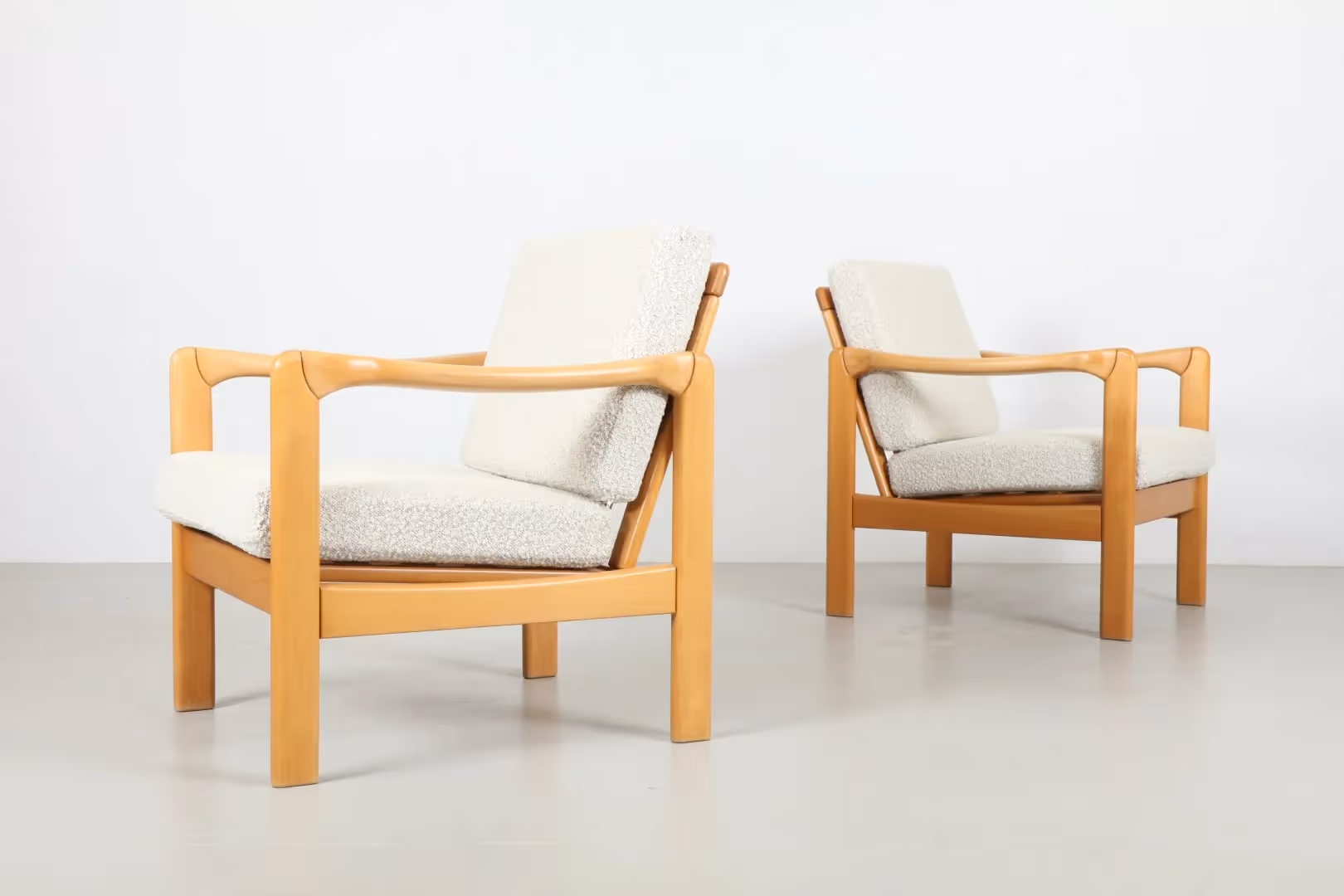 A stunning pair of mid-century European armchairs showcasing organic curves and a warm blonde timber frame. The low back and honest design create a relaxed, inviting silhouette, while contemporary boucle fabric adds a modern touch.