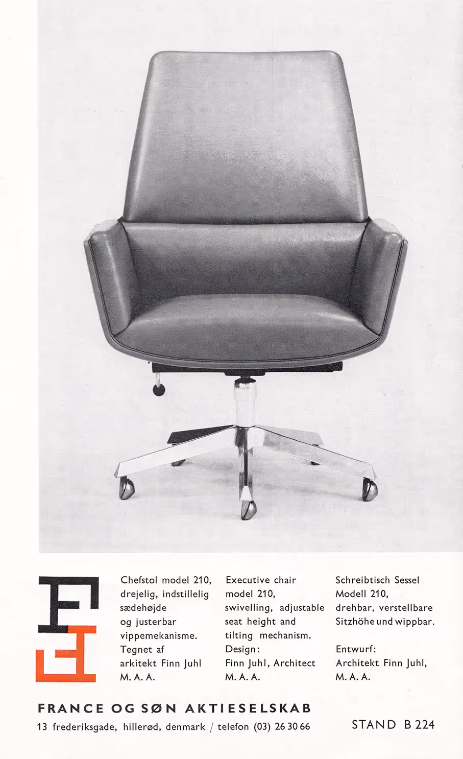 The Model 210 reflects Juhl's philosophy of merging form and function, making it not just a seating solution, but a statement of style and professionalism. Ideal for executives or home offices, this chair remains a timeless classic that continues to inspire and impress.