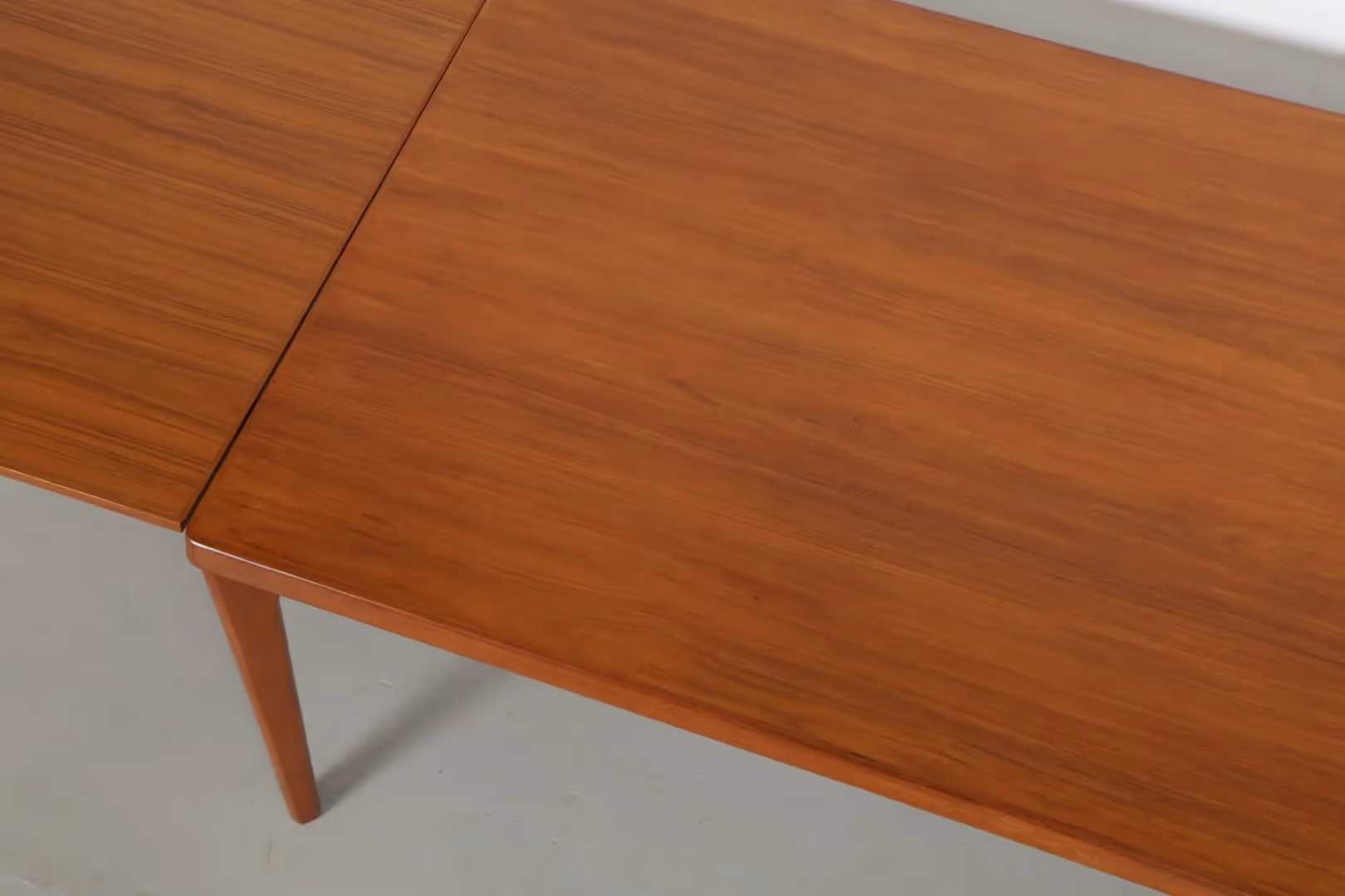 A refined example of Danish design, this Henning Kjaernulf dining table by Vejle Stole Mobelfabrik showcases timeless elegance in premium teak. The simple, spacious tabletop is beautifully supported by slender, tapered legs, creating a light and sophisticated silhouette.