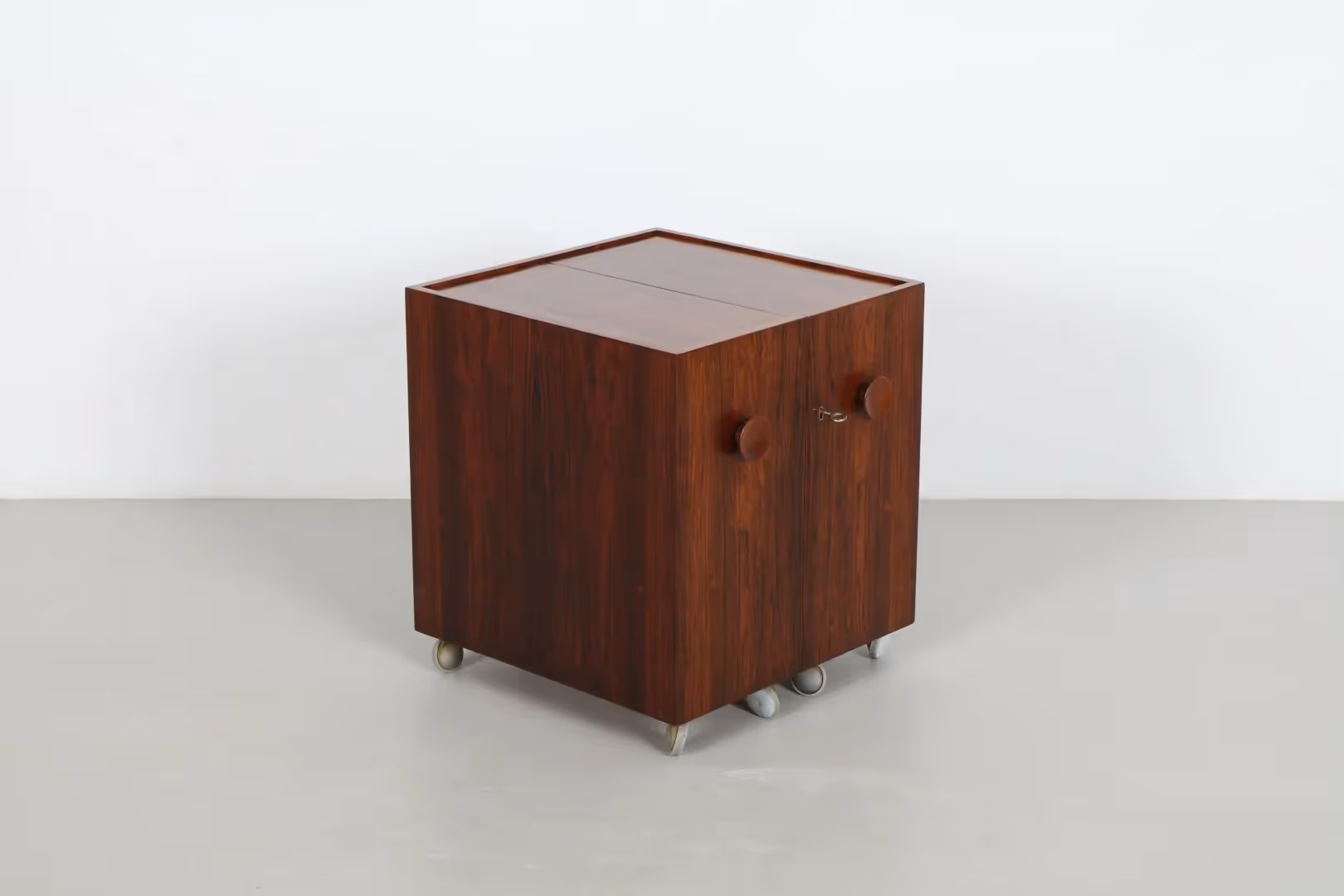 A striking example of Danish design, the Knud Bent 'Bar Cube' by Dyrlund is crafted from rich rosewood and features a compact, fold-out form ideal for modern entertaining.