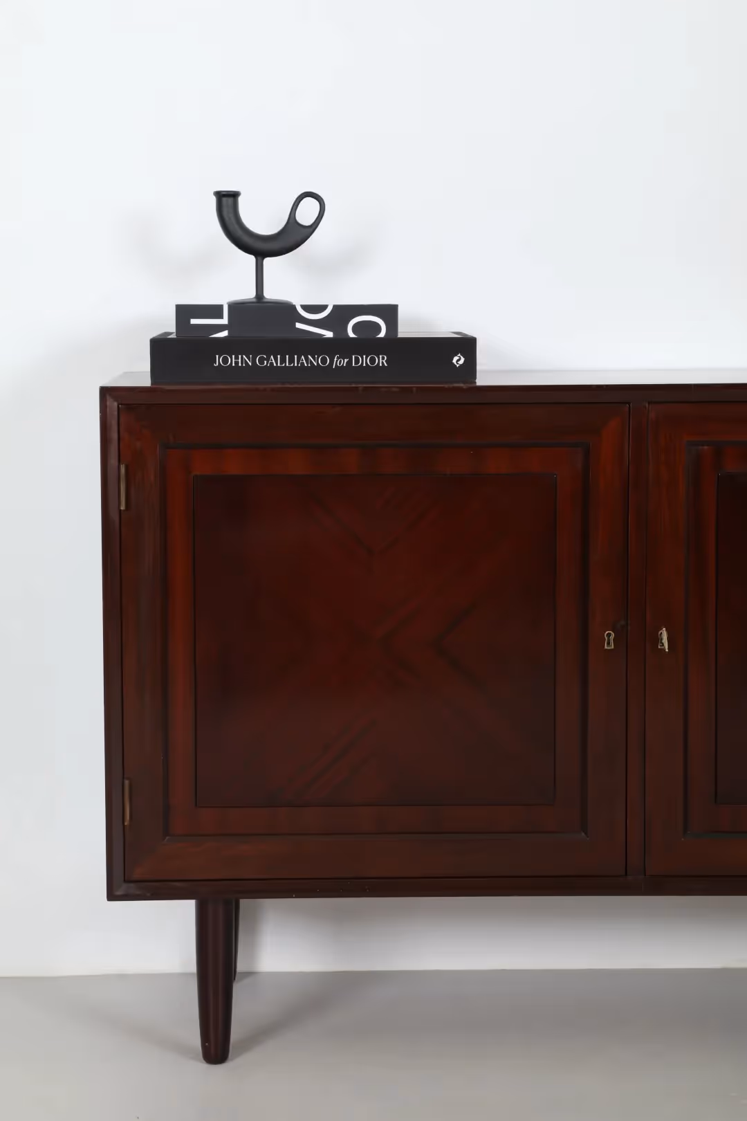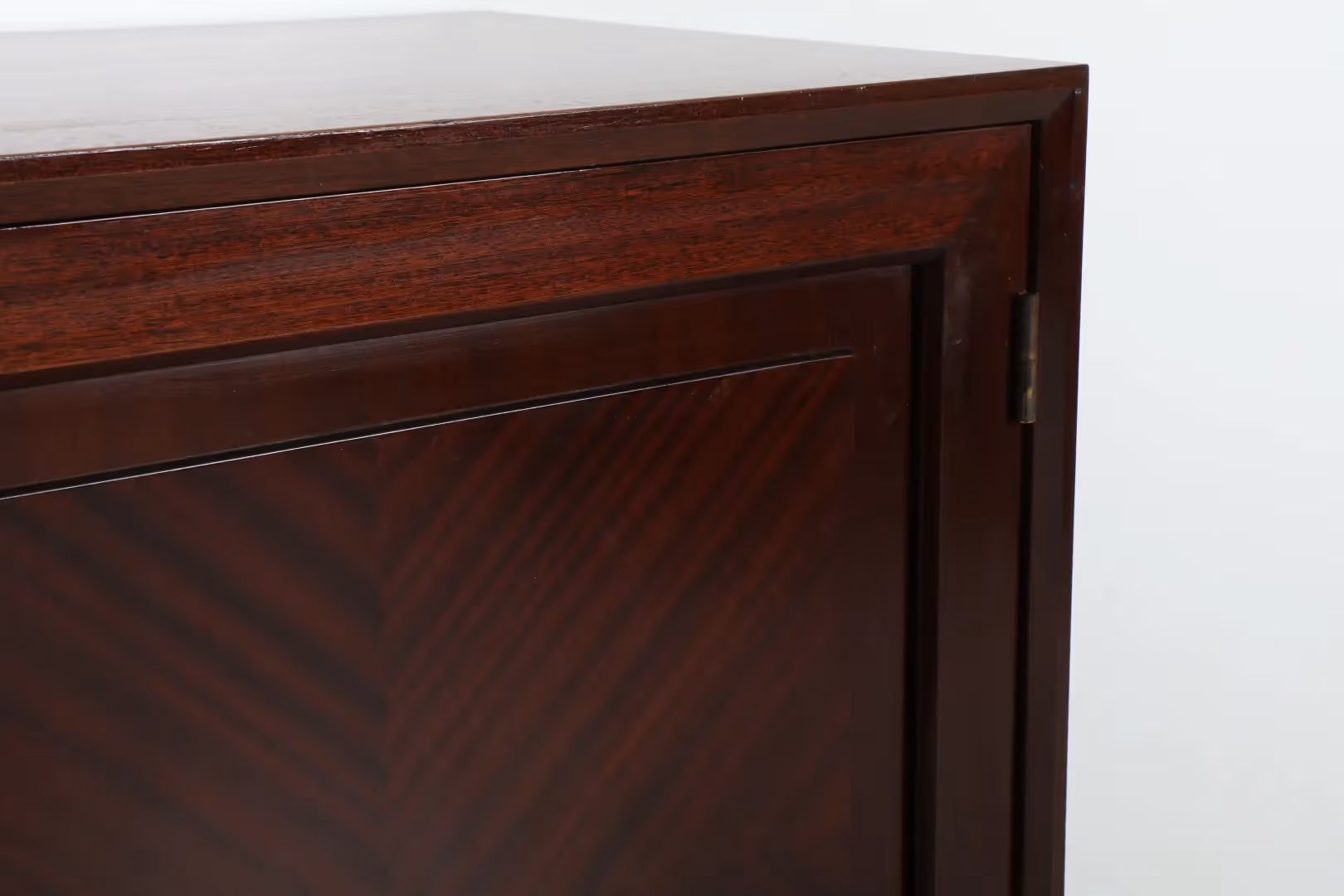 A refined example of Danish mid-century design, this compact sideboard is crafted in rich mahogany and showcases a striking veneer pattern across the front. Beautiful joinery edge details and elegantly tapered legs highlight the skilled craftsmanship.