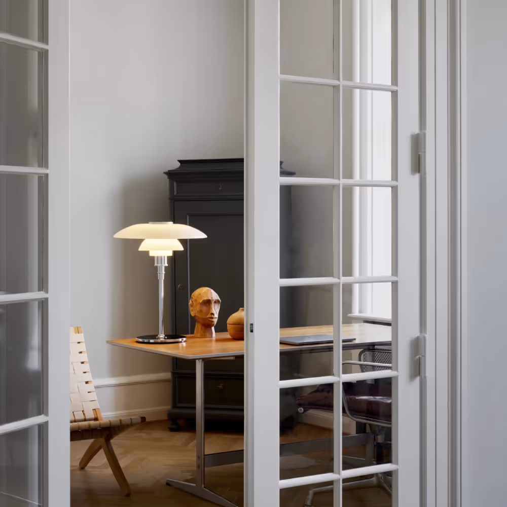 The ‘PH 4½ - 3½' Glass Table Lamp is a beautiful example of Henningsen’s three-shade system and features beautifully crafted mouth-blown glass on a polished chrome stem. It’s a modern icon that looks as stunning today and the day it was conceived.