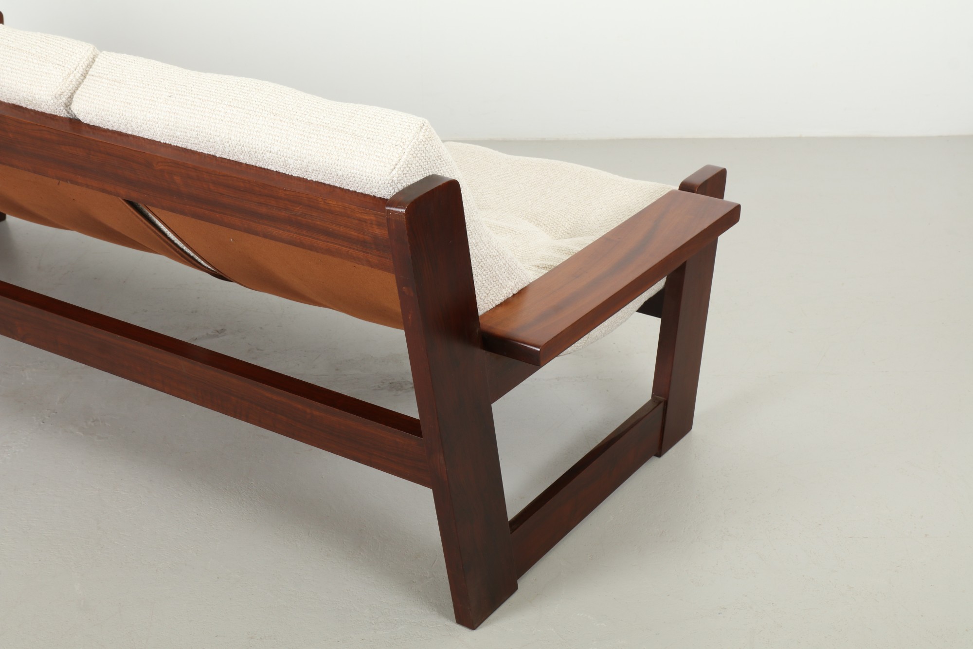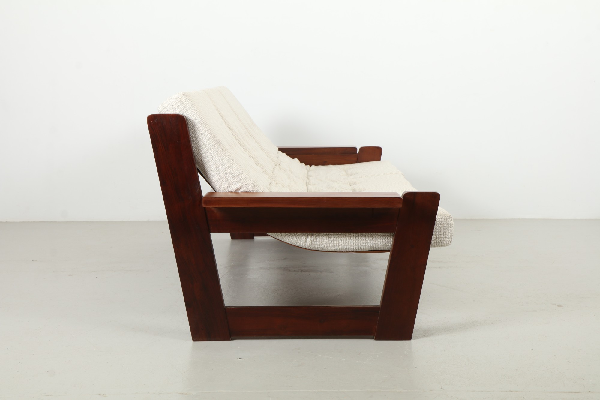 This striking 1970's sofa perfectly captures the influence of the brutalist aesthetic on modern design. Substantial slabs of vibrant Imbuia hardwood create a confident angular frame with an intentional contrast to the refined and organic forms that dominated the 1950s and 60s.