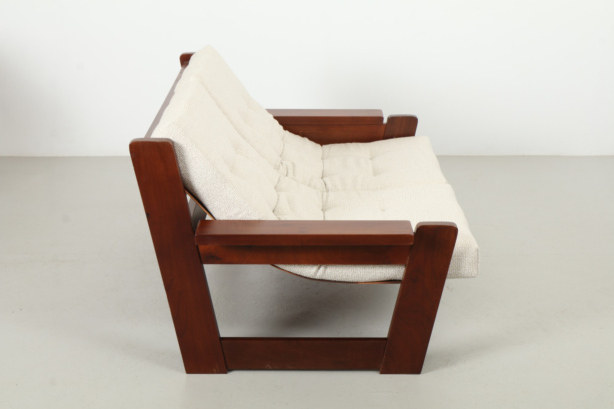 This striking 1970's sofa perfectly captures the influence of the brutalist aesthetic on modern design. Substantial slabs of vibrant Imbuia hardwood create a confident angular frame with an intentional contrast to the refined and organic forms that dominated the 1950s and 60s.