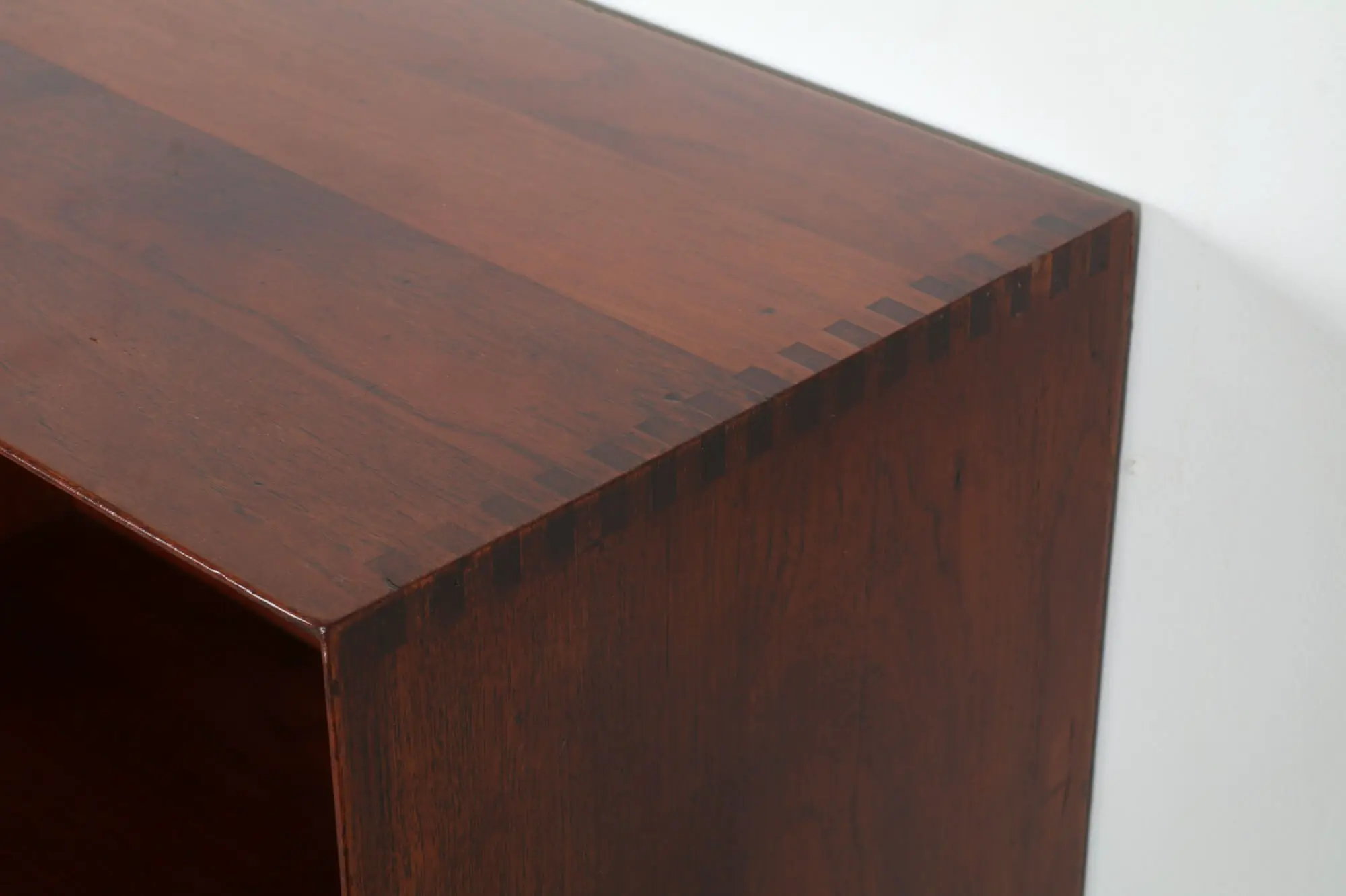 Here's another win for the Danes. This elegant, well crafted piece is perfect for books, design objects or just about anything you can think of. The raised cabinet is refined and practical with three linear spaces divided by a series of adjustable shelves.