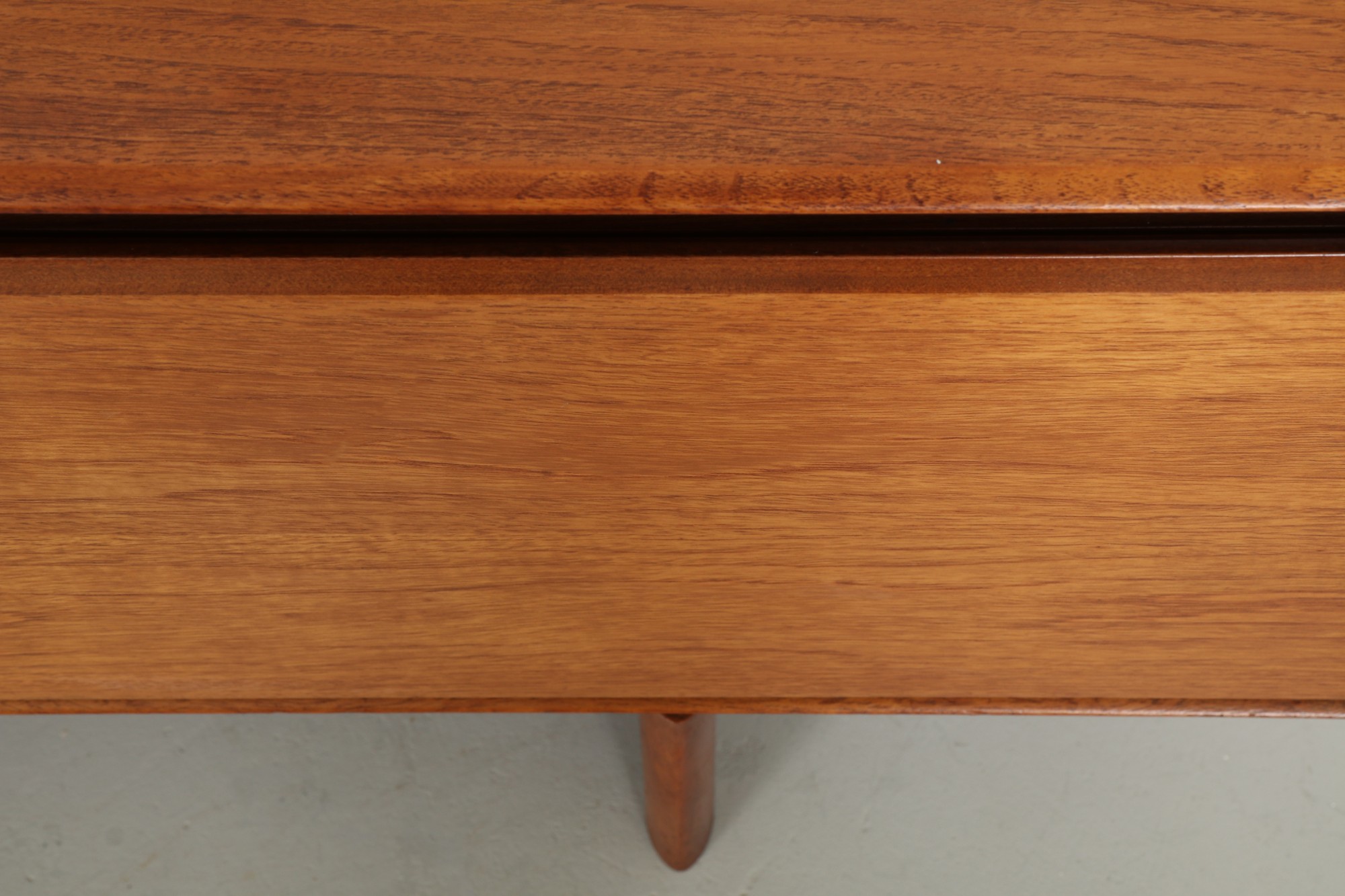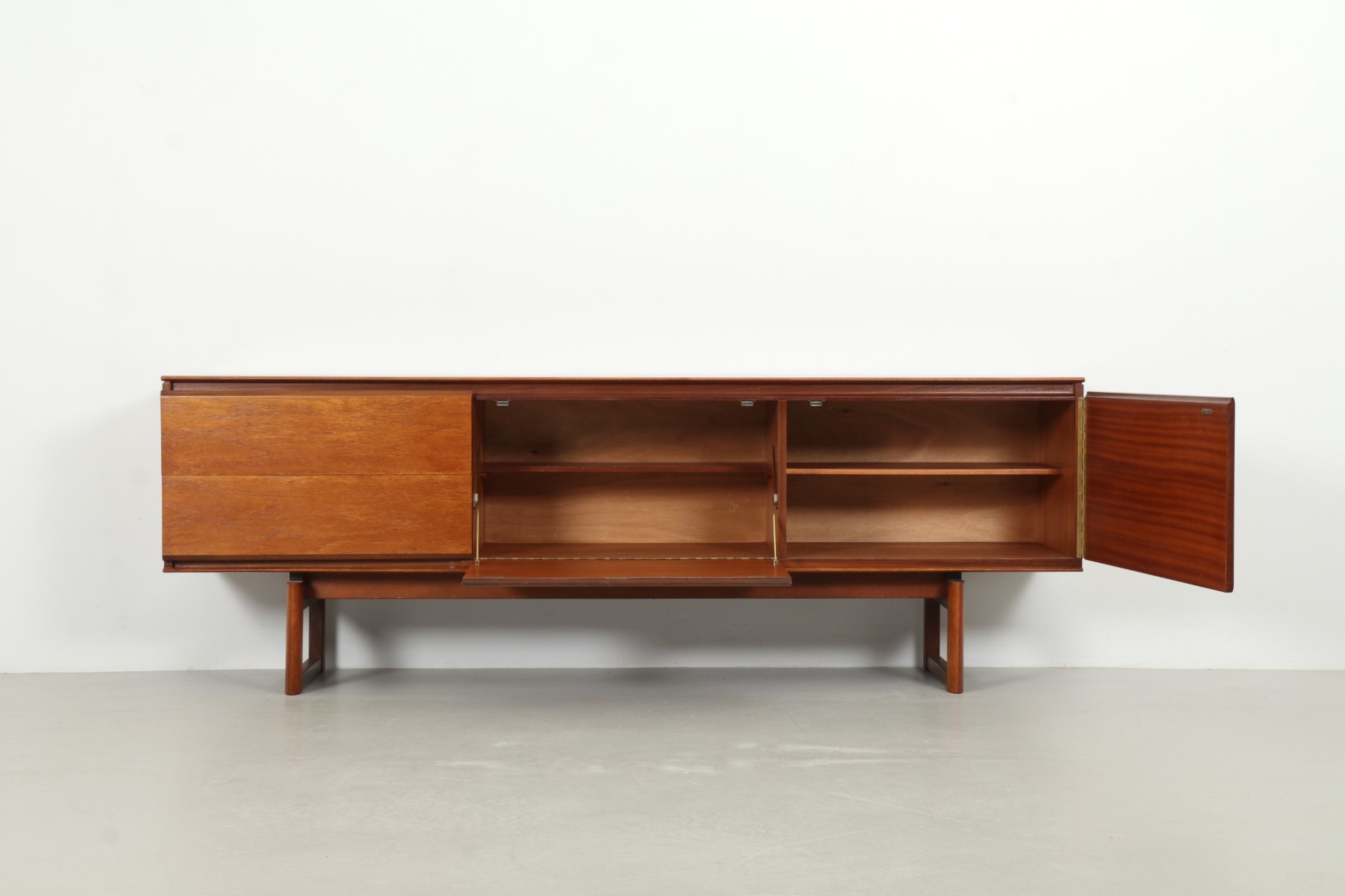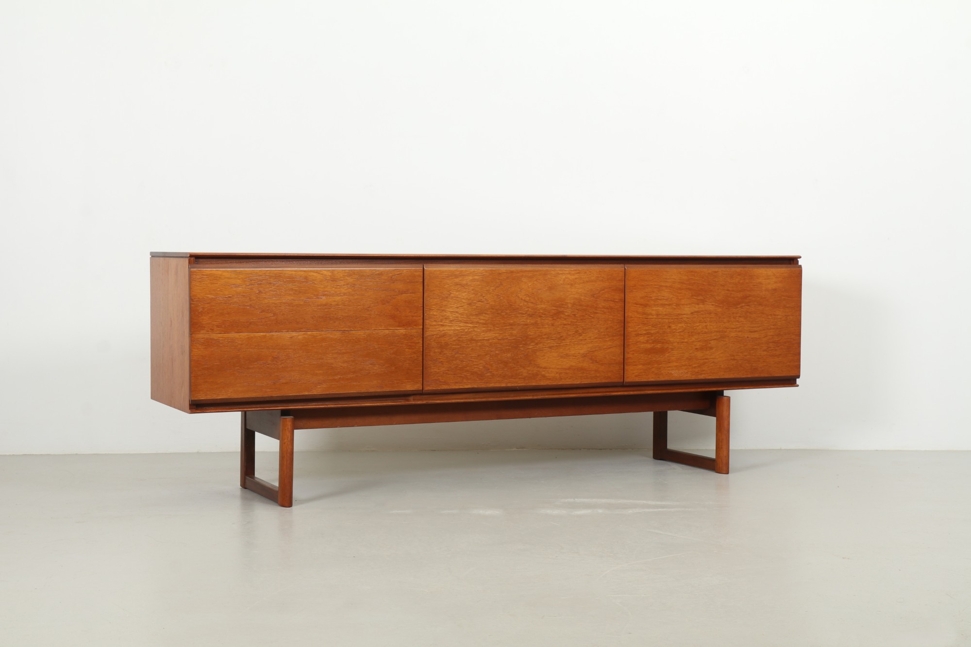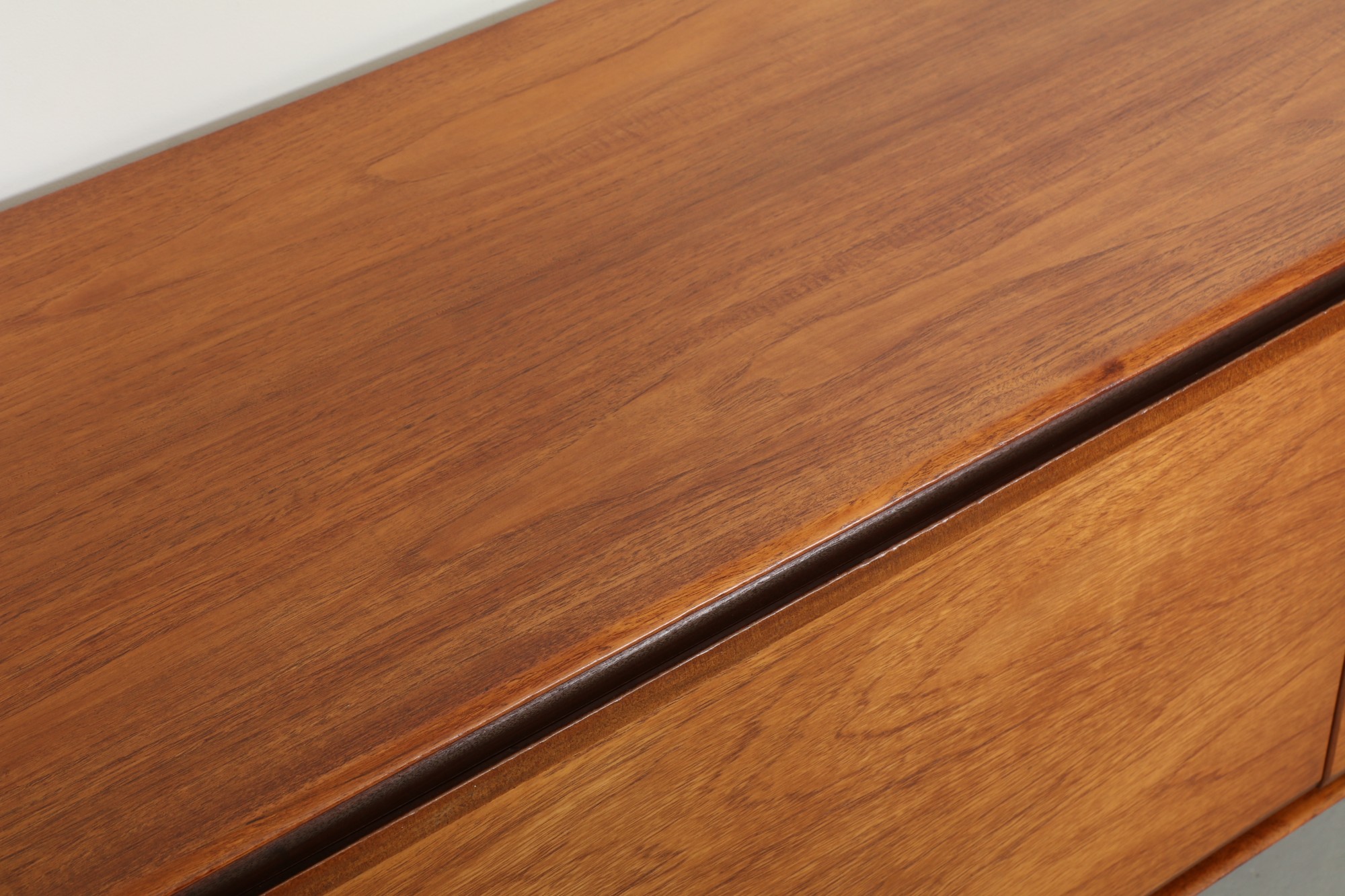 Set low on a crisp sleigh leg base, the Chilgrove sideboard by British designer Philip Hussey is a study in pared-back mid-century elegance. The streamlined profile celebrates luminous teak grain and precision craftsmanship, while thoughtful proportions suit modern living.