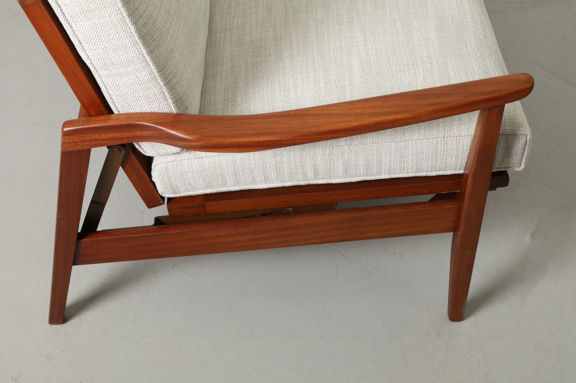This classic sofa features a refined lightness of form and elegant armrests with sweeping organic curves. It was made here in New Zealand by skilled craftsmen from high end materials. The timber frame is a rich highly grained mahogany, perfect for any contemporary home.