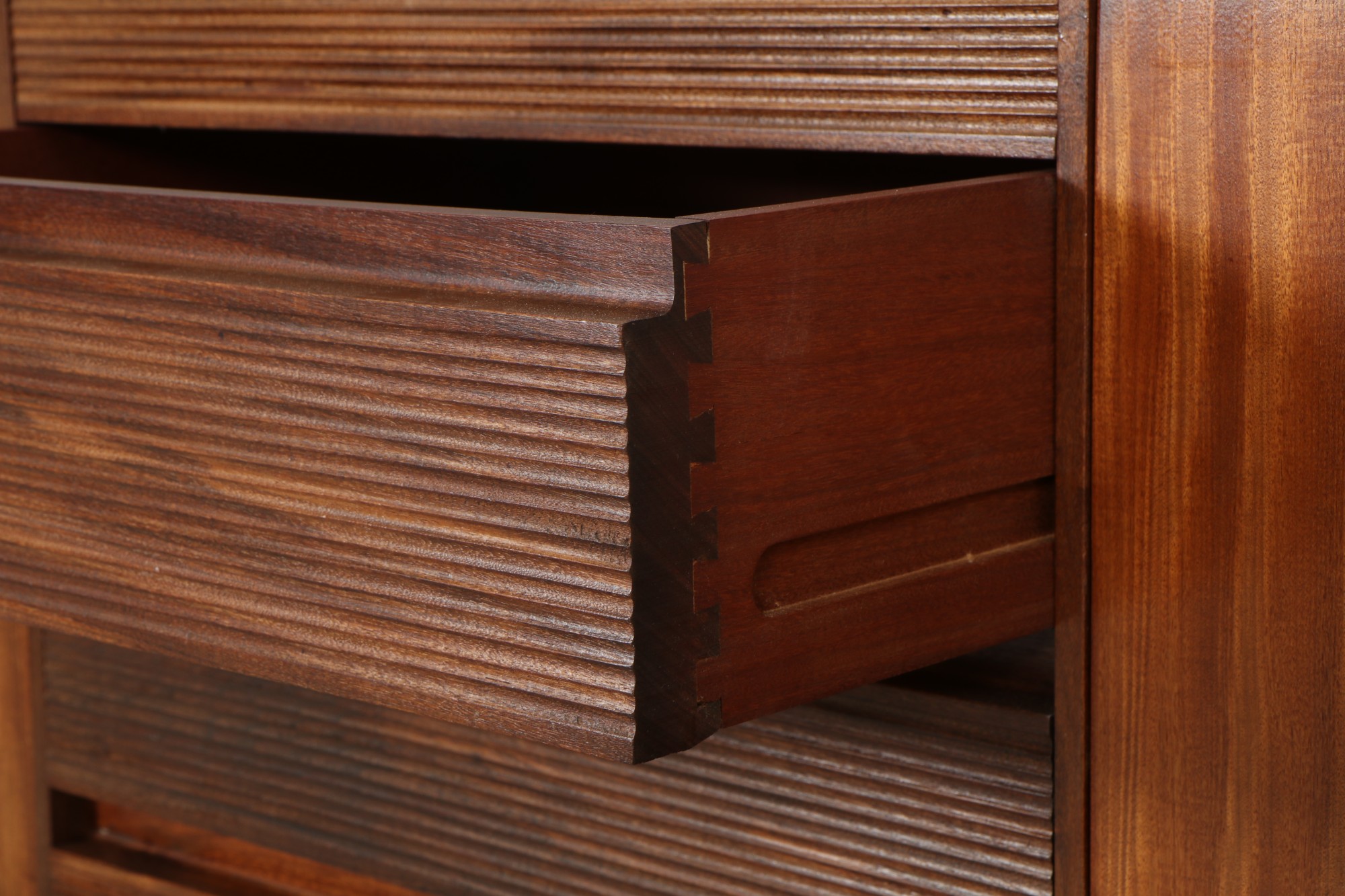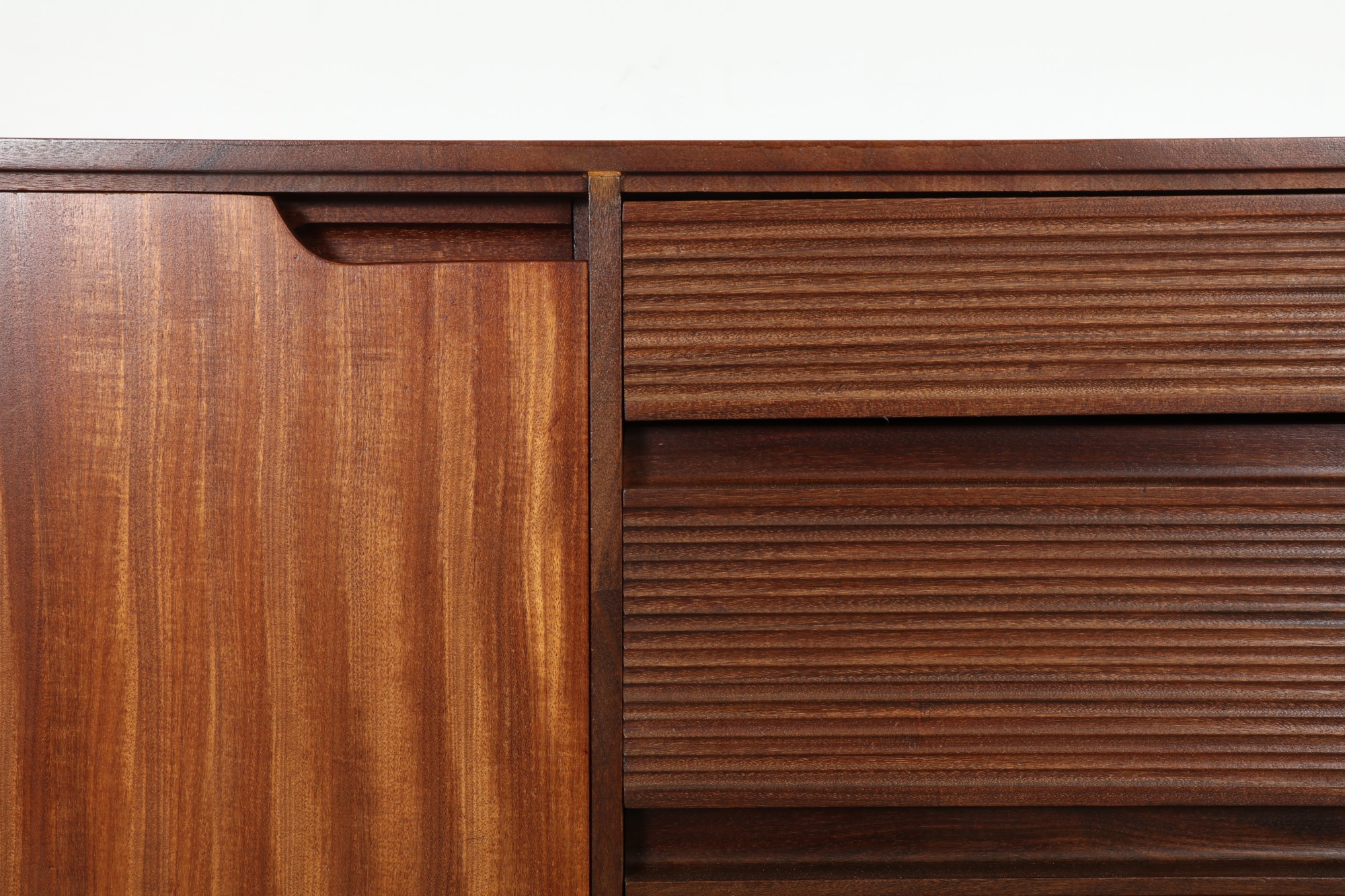 An impeccably crisp sideboard by Richard Hornby for Fyne Ladye, realised in richly toned afrormosia. The elegant form showcases stylish ribbed drawers framed by clean, architectural lines, creating a refined mid-century statement.