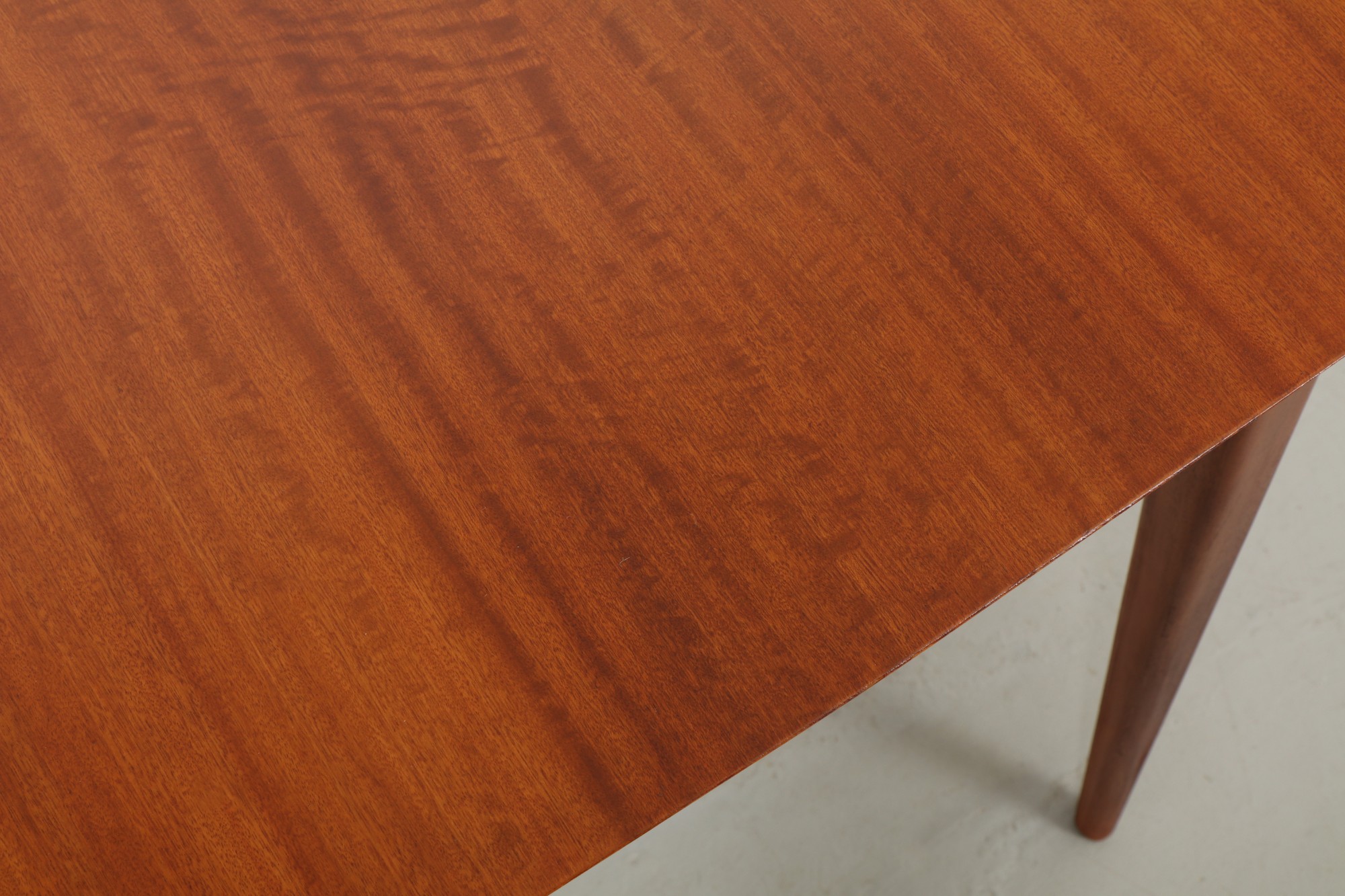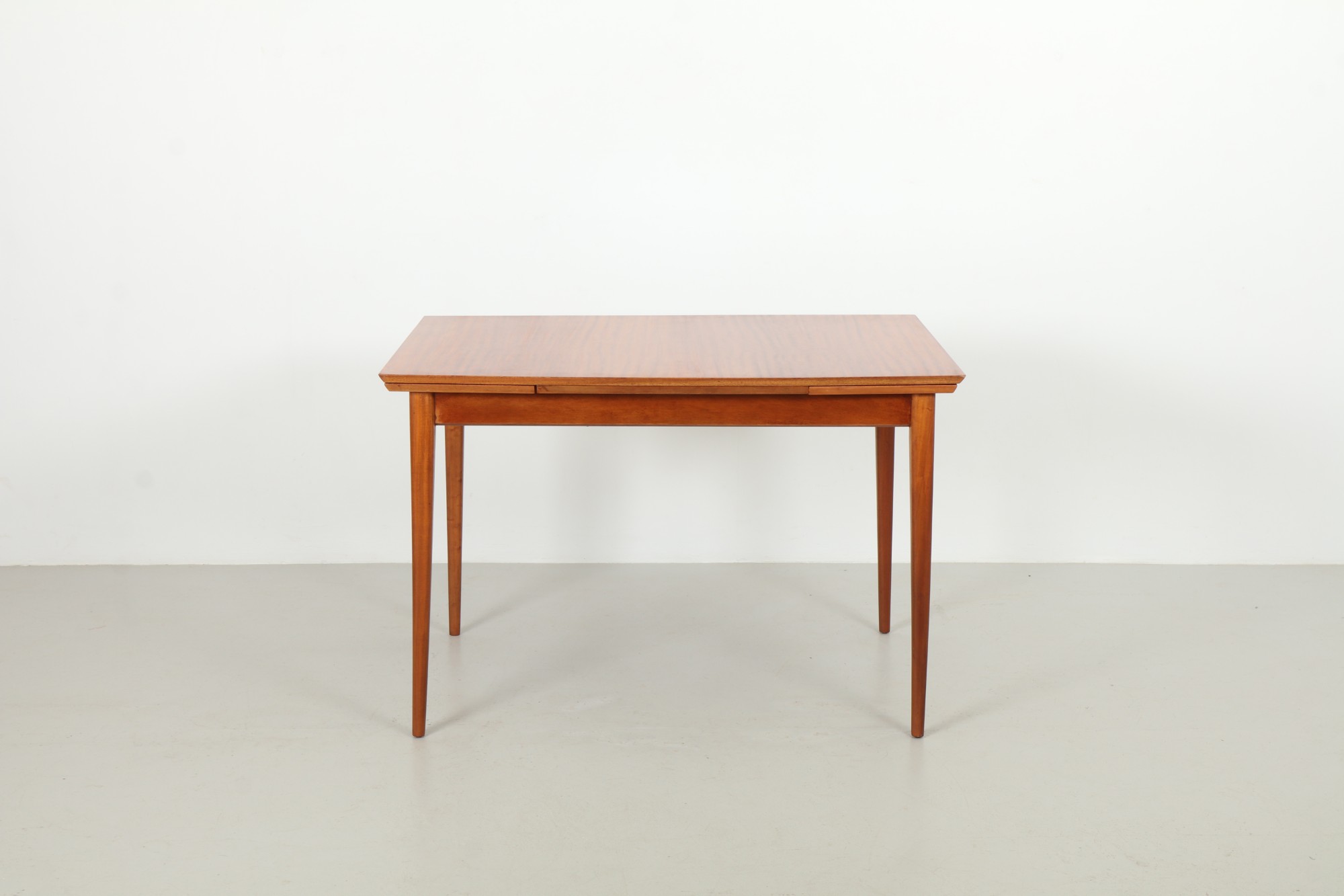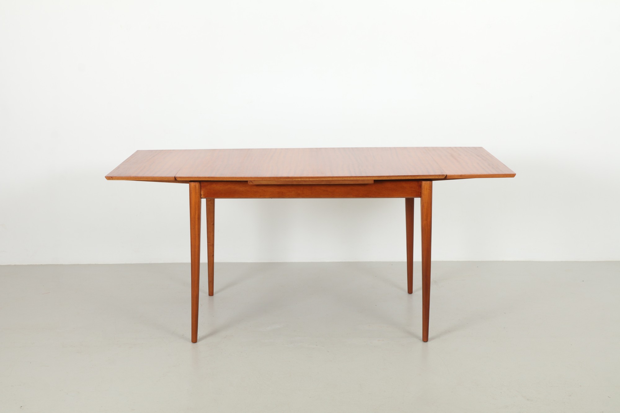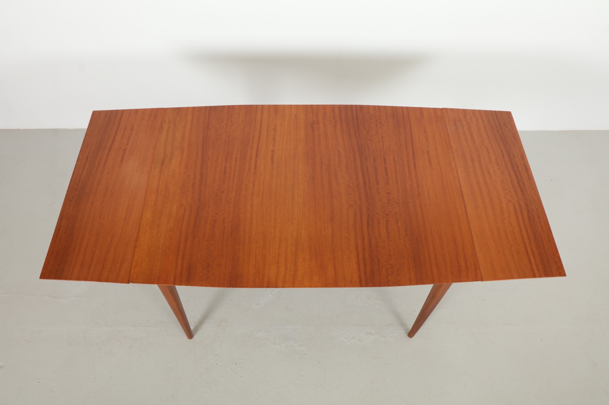 A charming 1950s British design with a sleek mahogany top and distinctive cigar legs. Compact in footprint yet generous in function, it comfortably seats four and extends to welcome six.