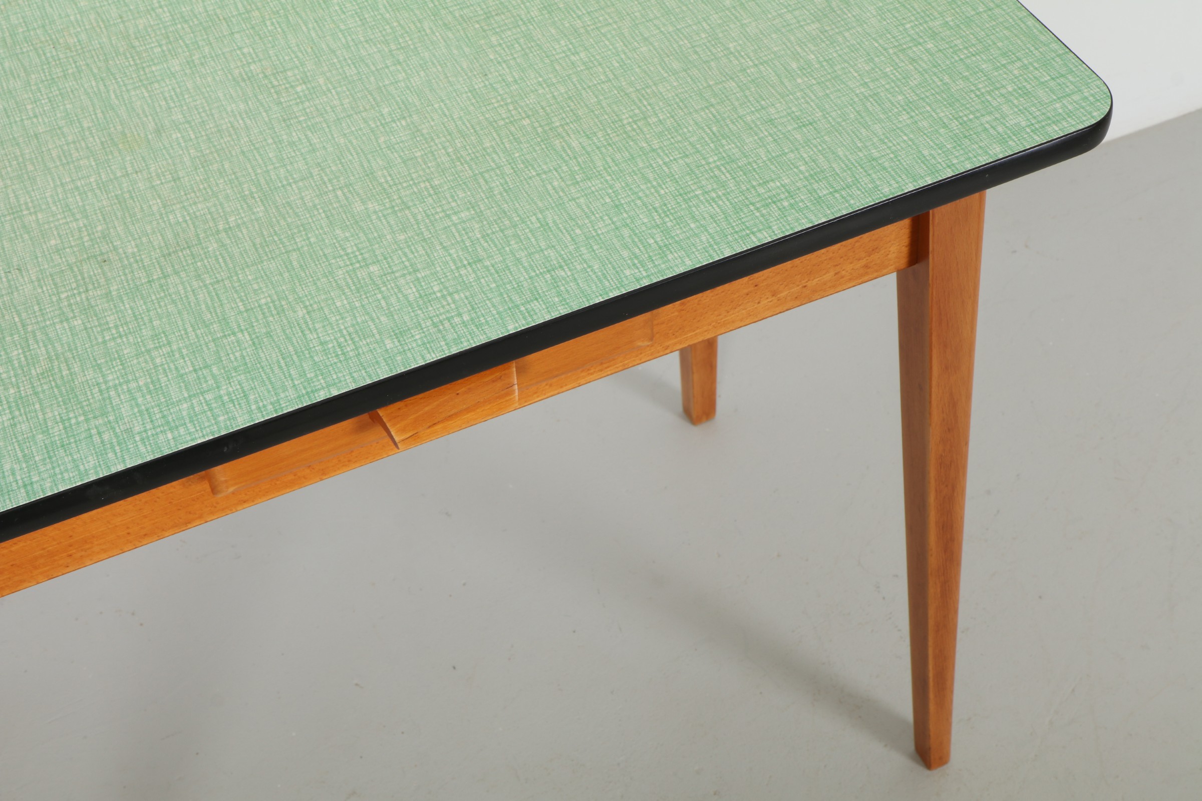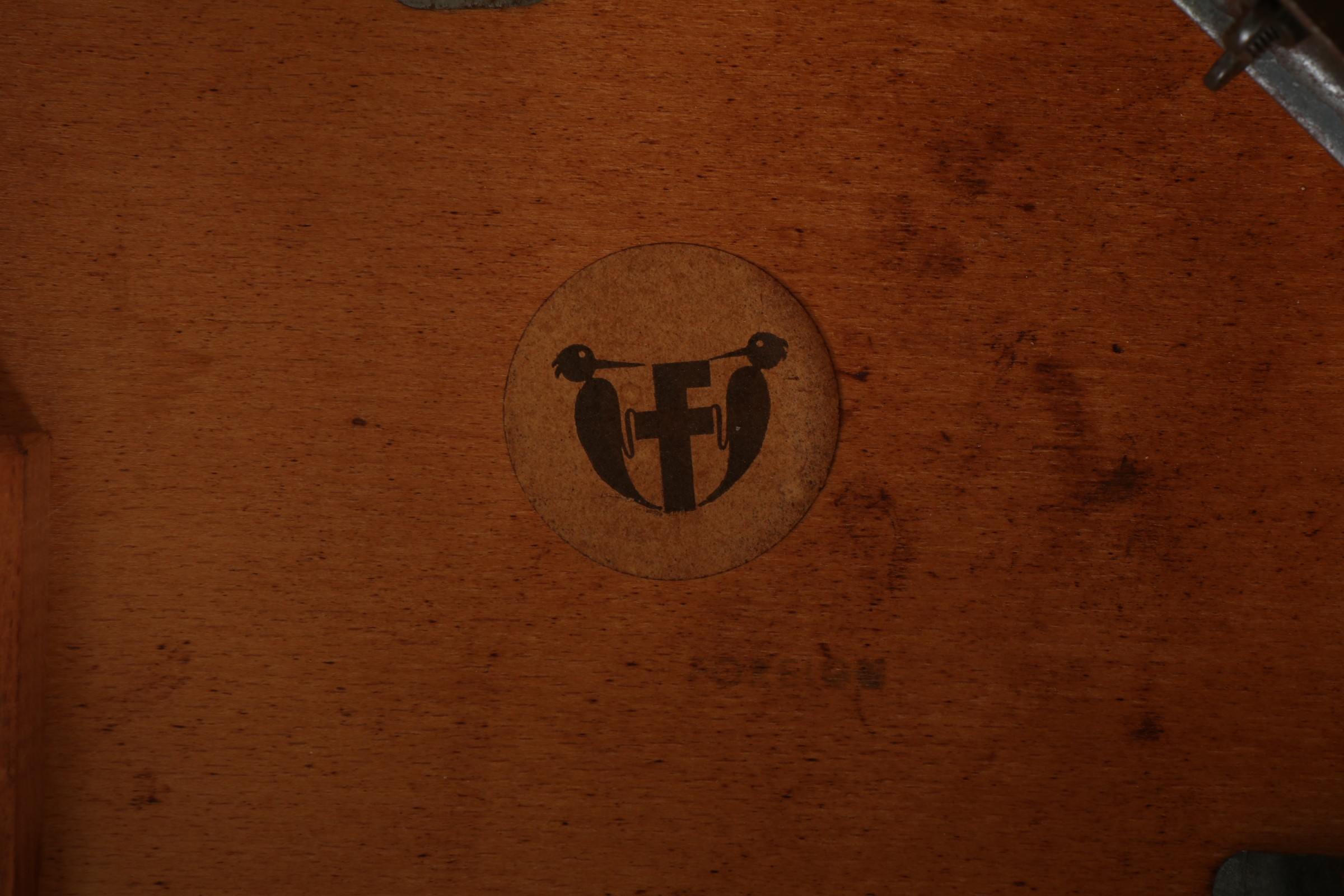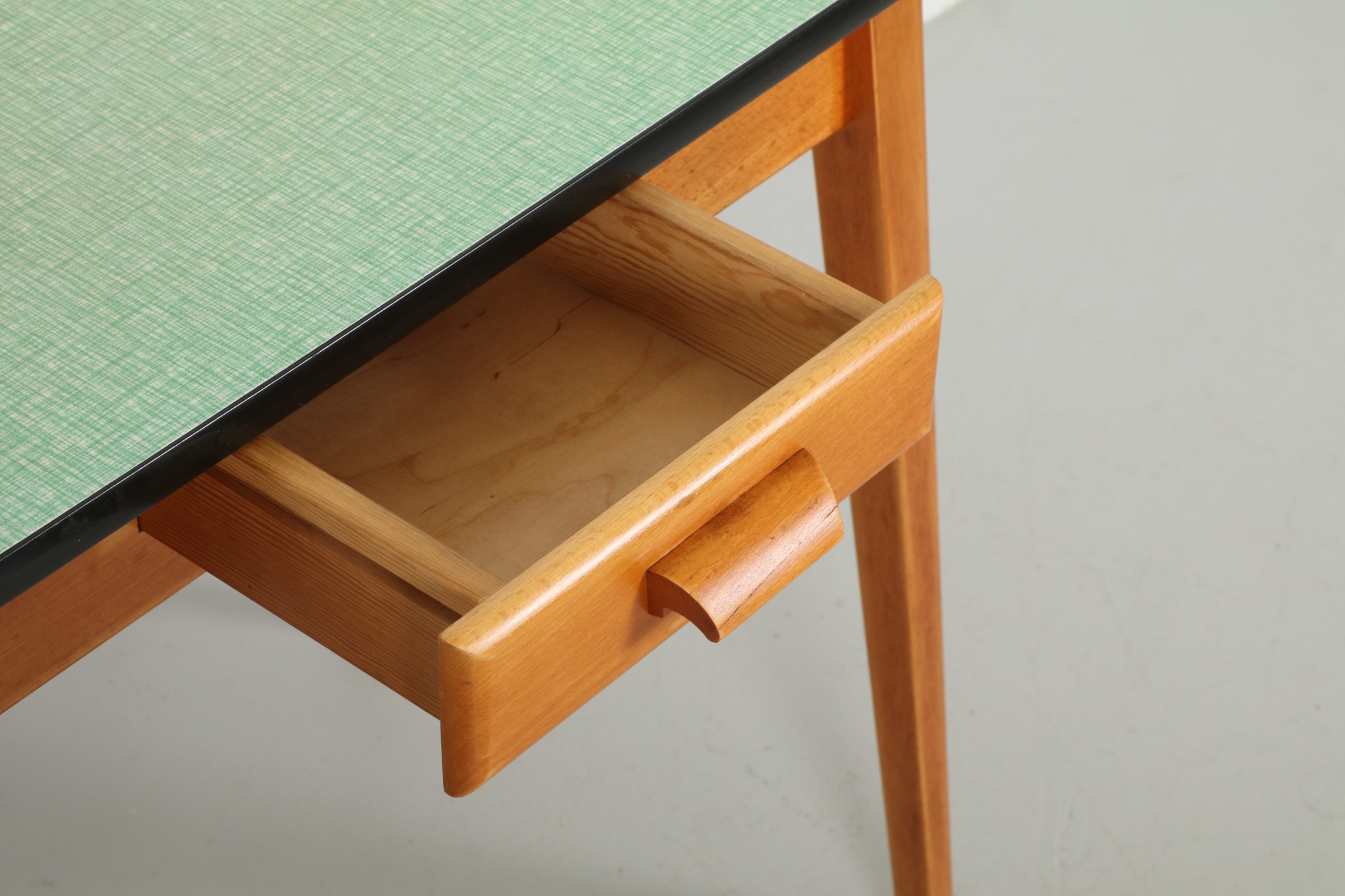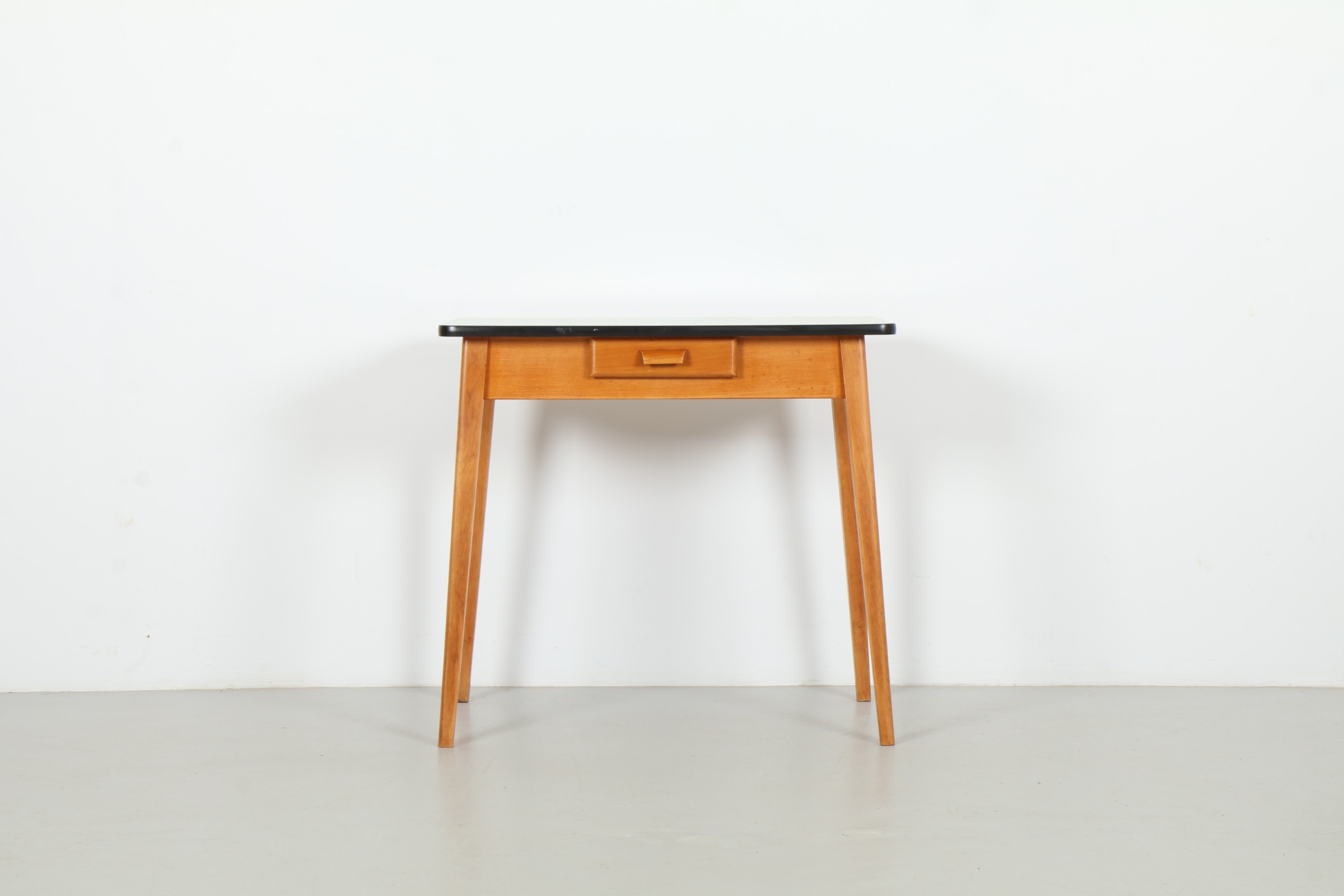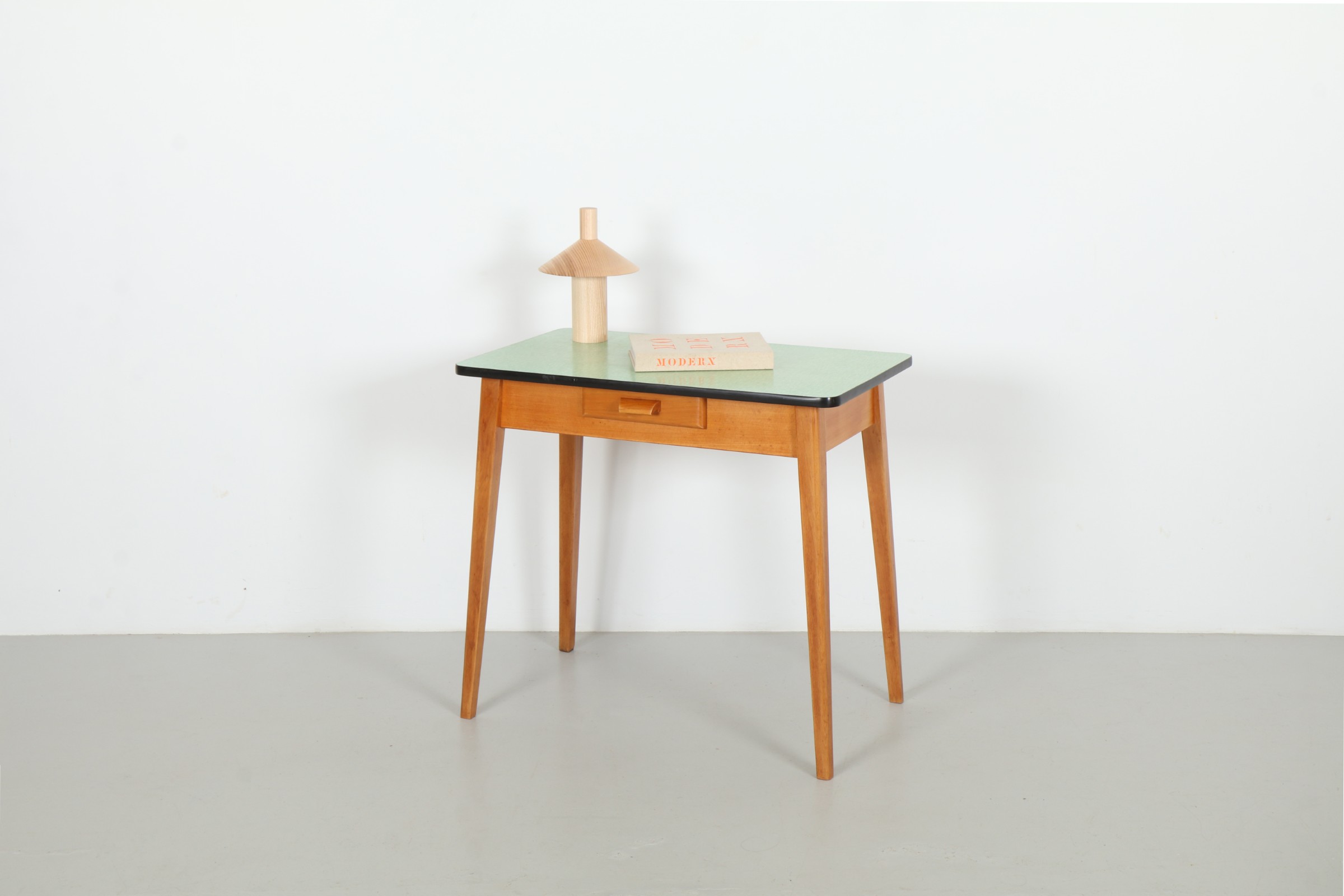 This compact 1950s British desk embraces utilitarian design with clean, linear proportions and an honest material palette. A resilient Formica top delivers an easy-care, hard-working surface with subtle mid-century character, ideal for daily tasks in a studio, apartment or home office.