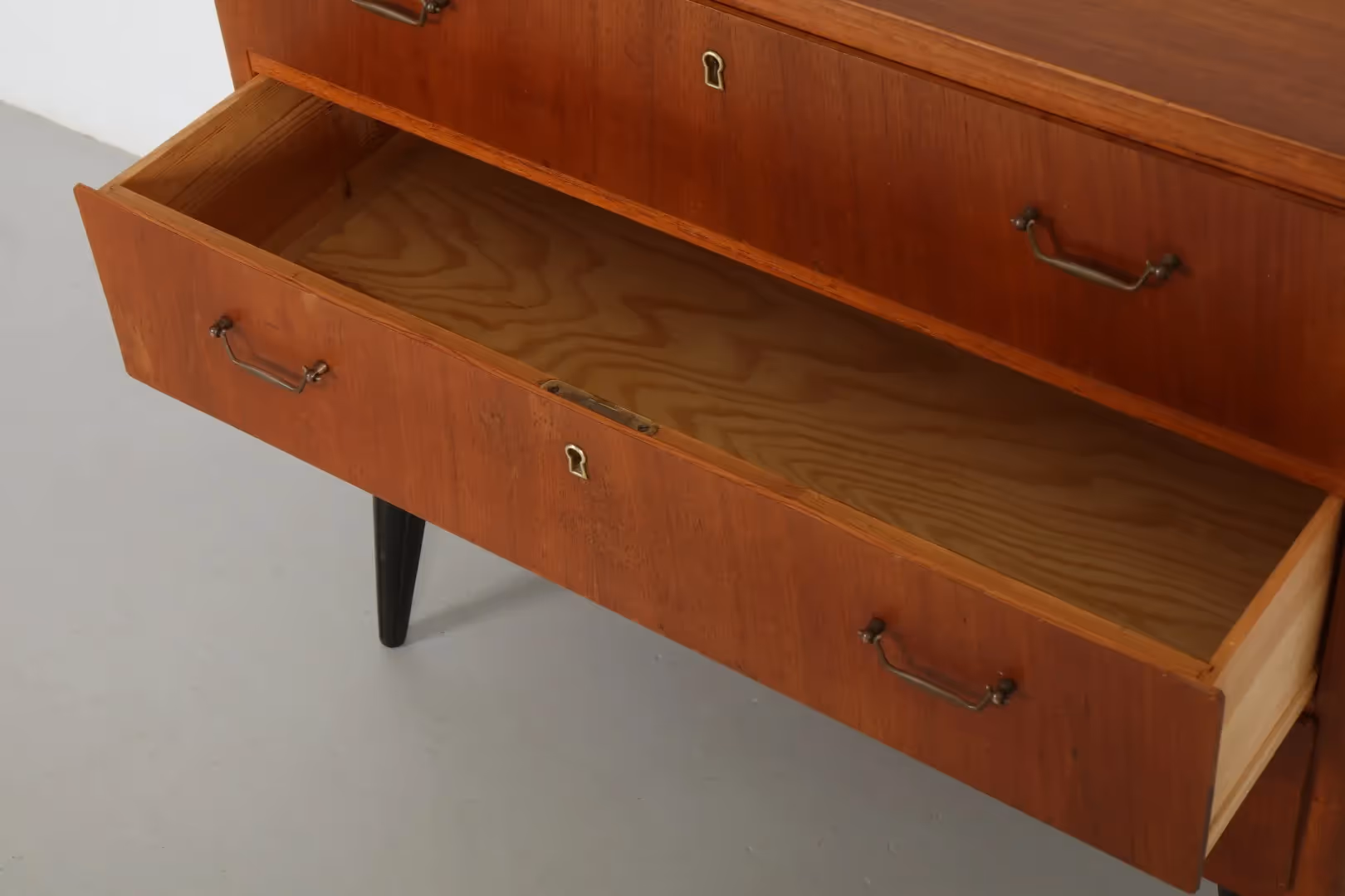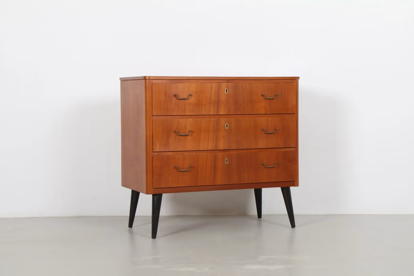 A charming example of Scandinavian mid-century design, this compact Swedish chest of drawers features a beautifully grained teak exterior paired with striking ebonised legs.