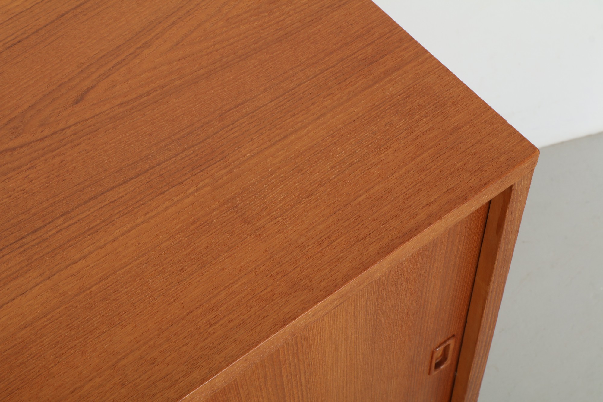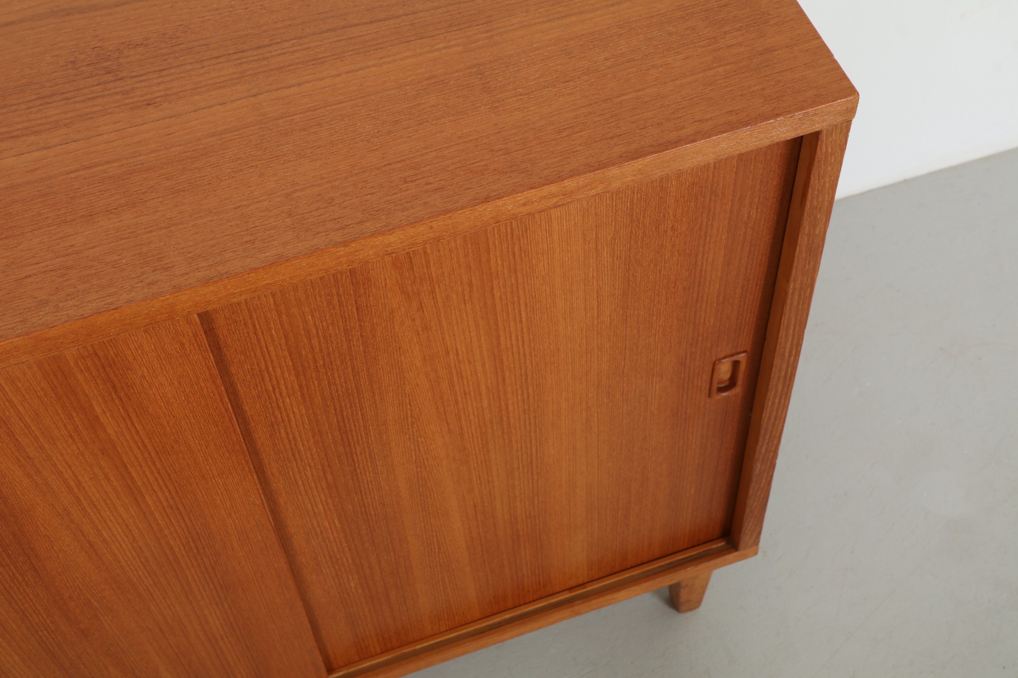Greater success was quick to follow, in 1954 the String shelving system earned the couple an international design prize, a gold medal at the Milan Triennial. Today String shelving is a mid-century design icon and just as beautiful, functional and desirable as the day it was invented. This compact sideboard piece is a functional, standalone component of the design with teak construction and functional sliding doors.