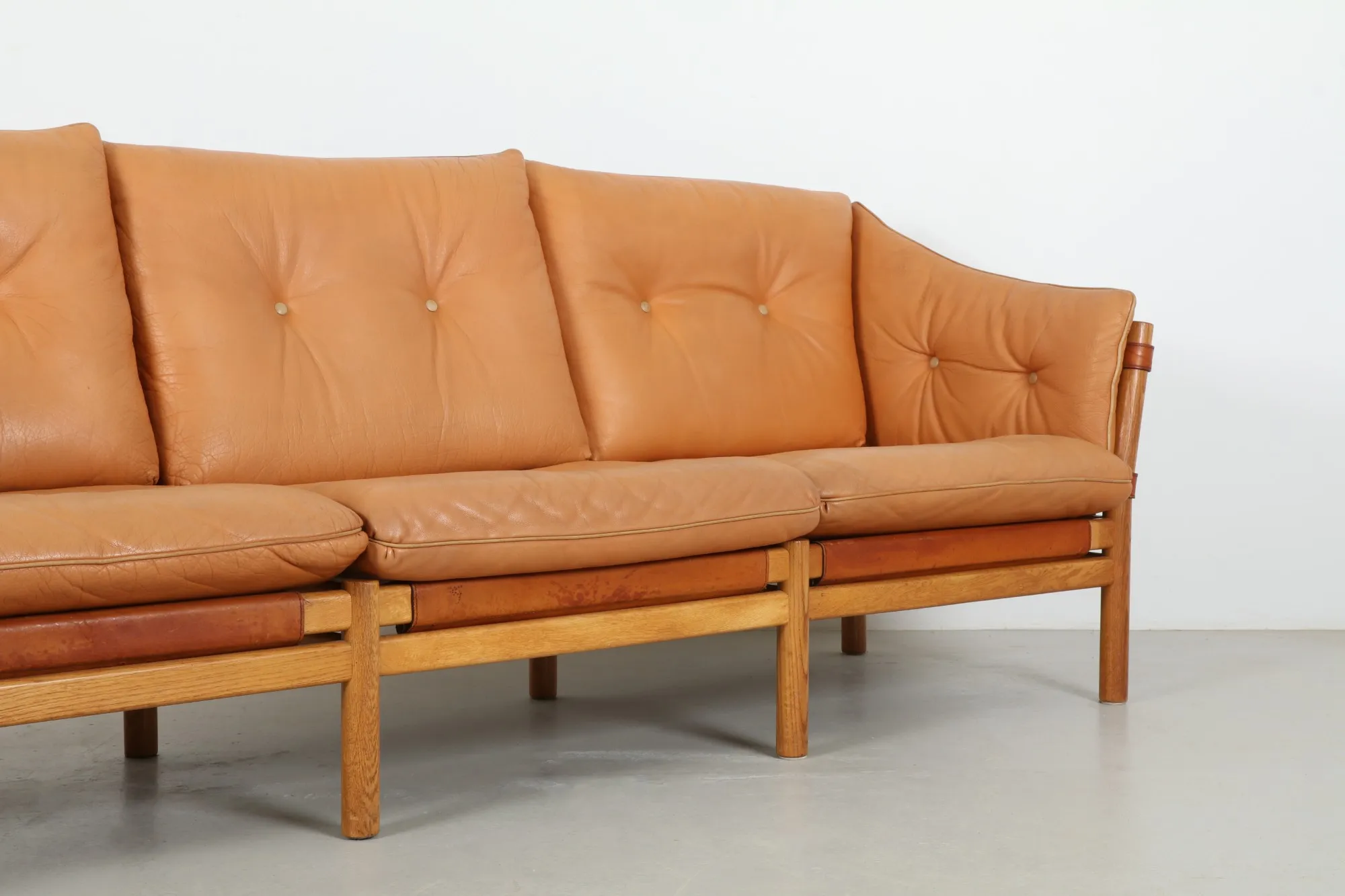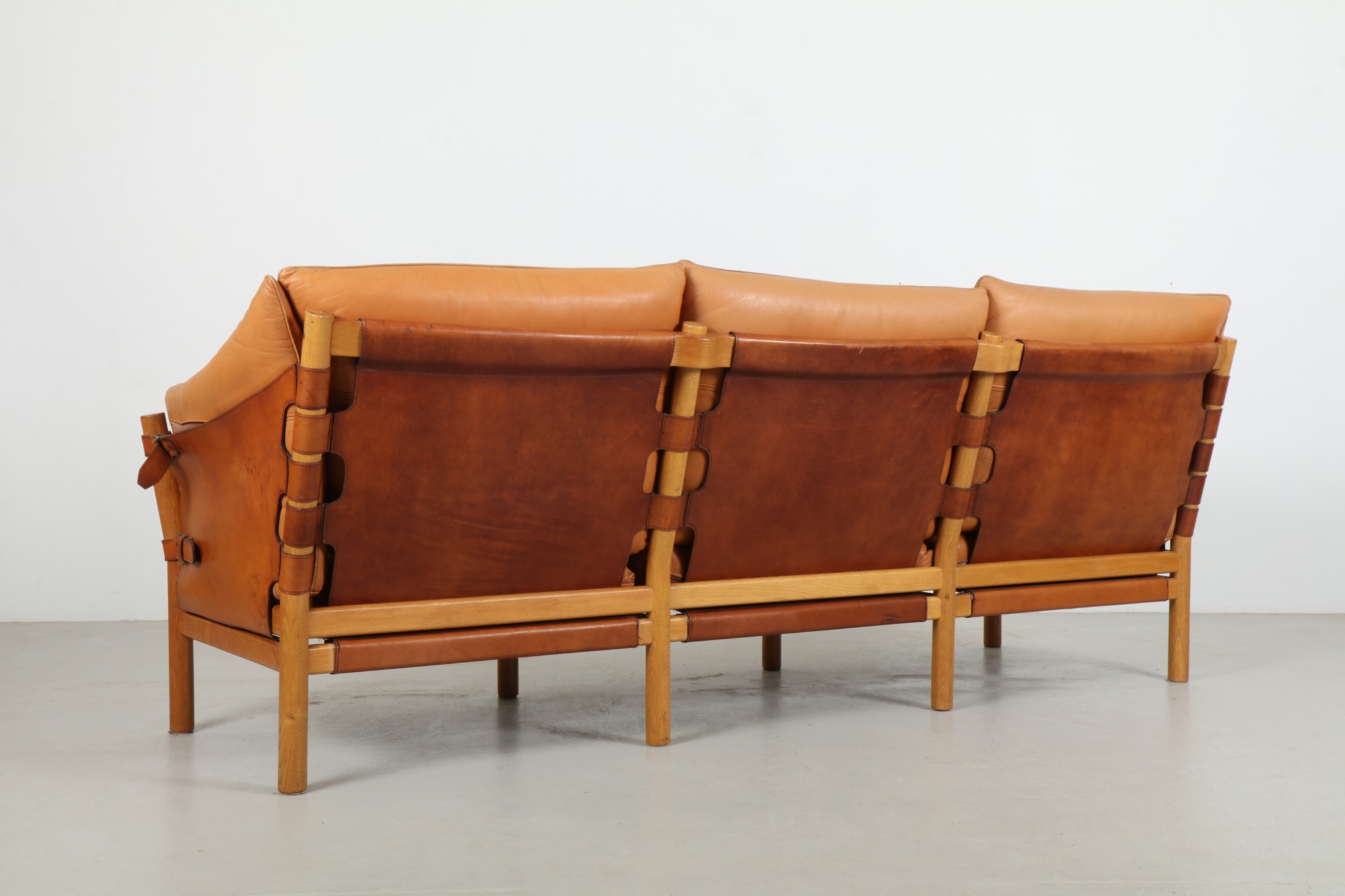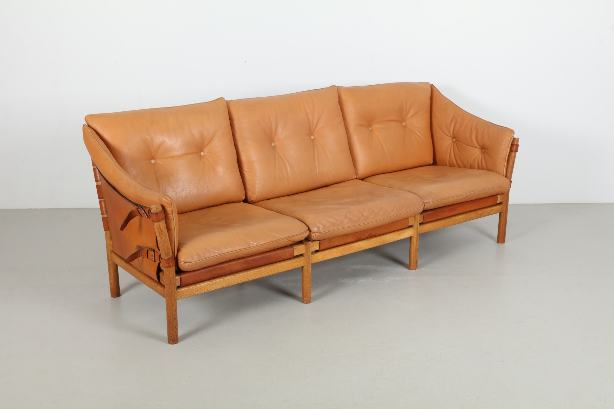 Deluxe Scandinavian three-seat leather sofa in the spirit of Arne Norell, pairing relaxed luxury with refined, architectural lines. Thick hide leather side and back supports are crafted with robust straps and metal buckles, lending tactile depth and a sling-style presence with subtle rustic character.