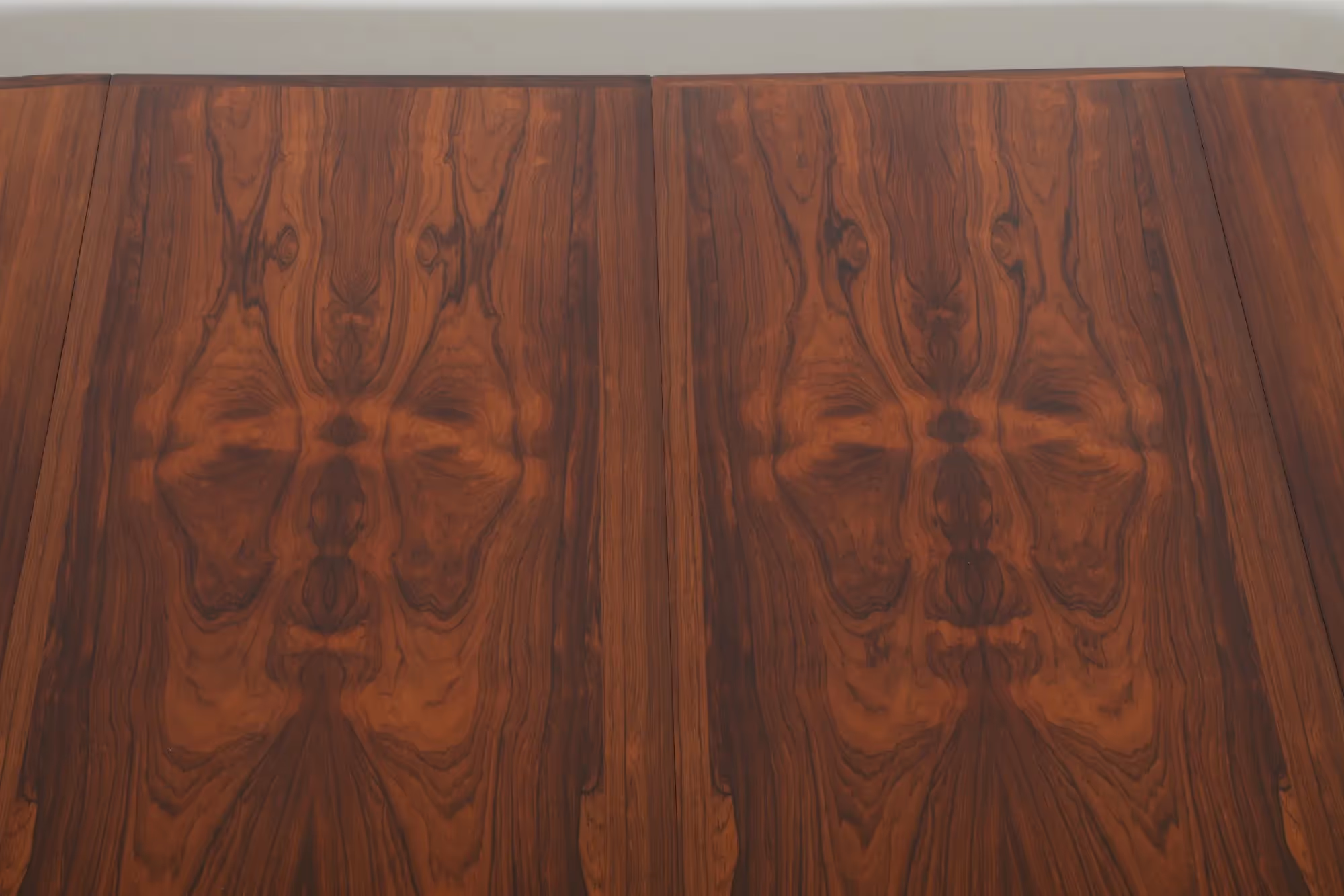An elegant mid-century dining table by Ole Hald for Gudme Mobelfabrik, crafted in richly figured rosewood with a refined, minimalist profile. The top showcases dramatic grain and precise joinery, set on a slender base for an airy, architectural stance. Two extension leaves glide into place to expand the setting for effortless entertaining.