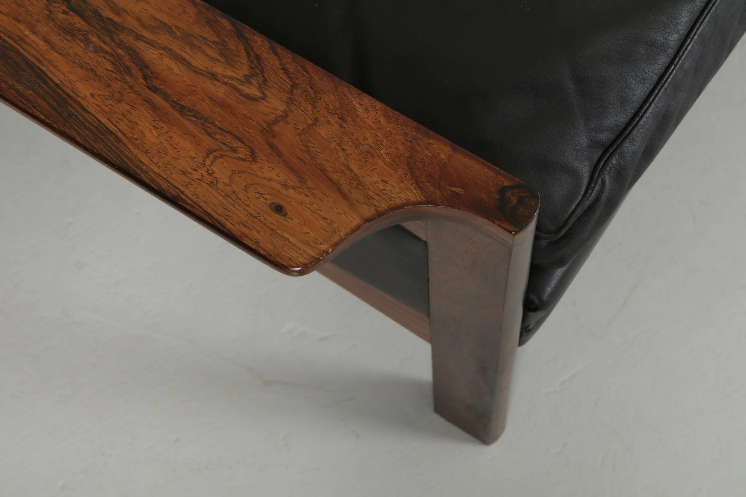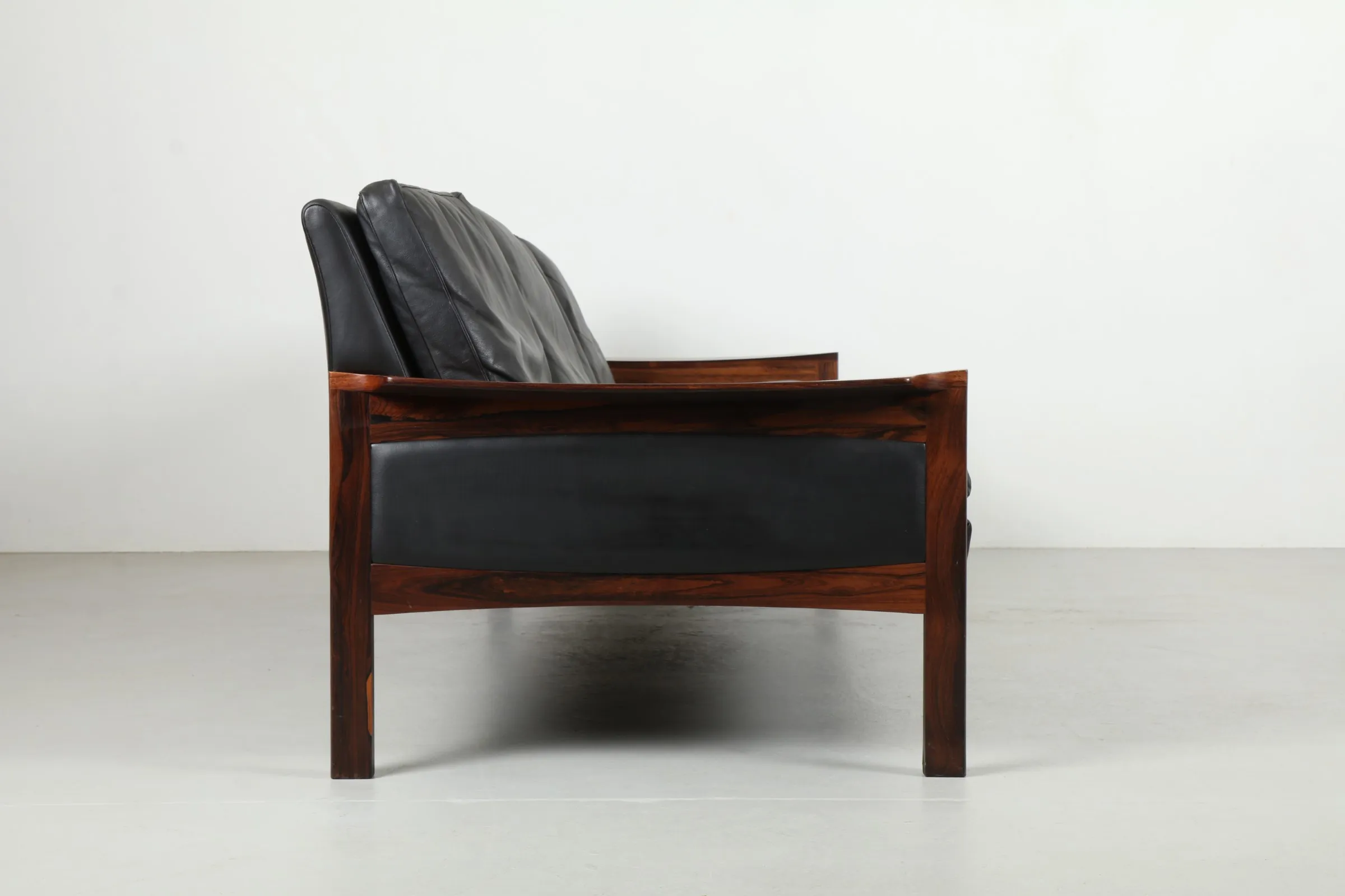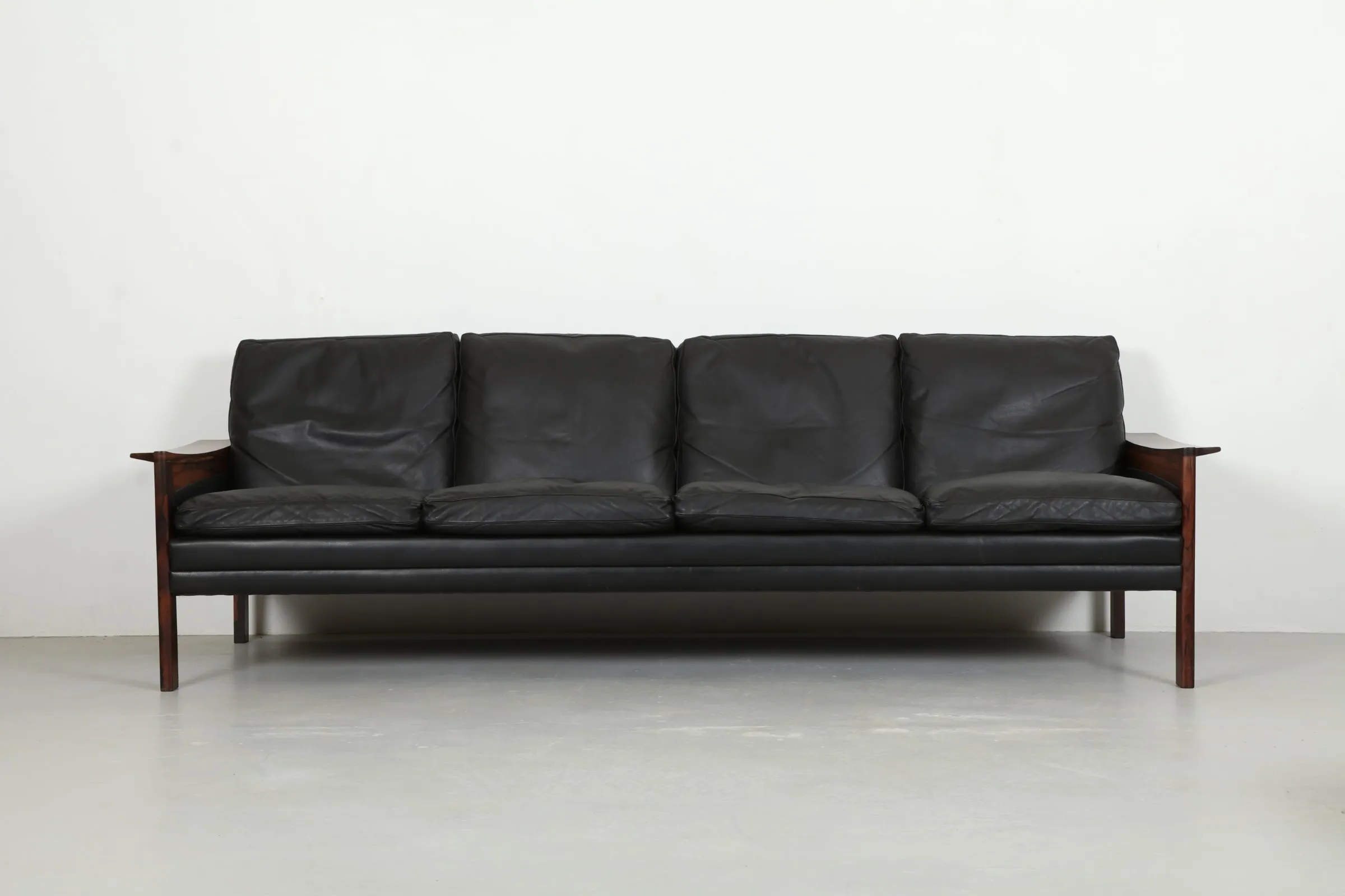 An elegant understated frame finished with black leather and rosewood detailing defines the 'Model 200' sofa by Reno Wahl Iversen. The sofa offers a low profile and high comfort with four seats enclosed by tastefully designed rosewood arms which flare up subtly at the ends.