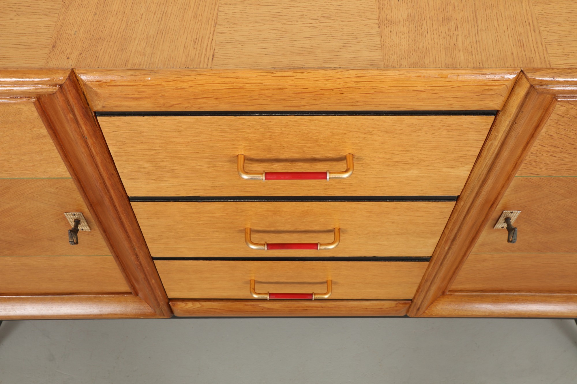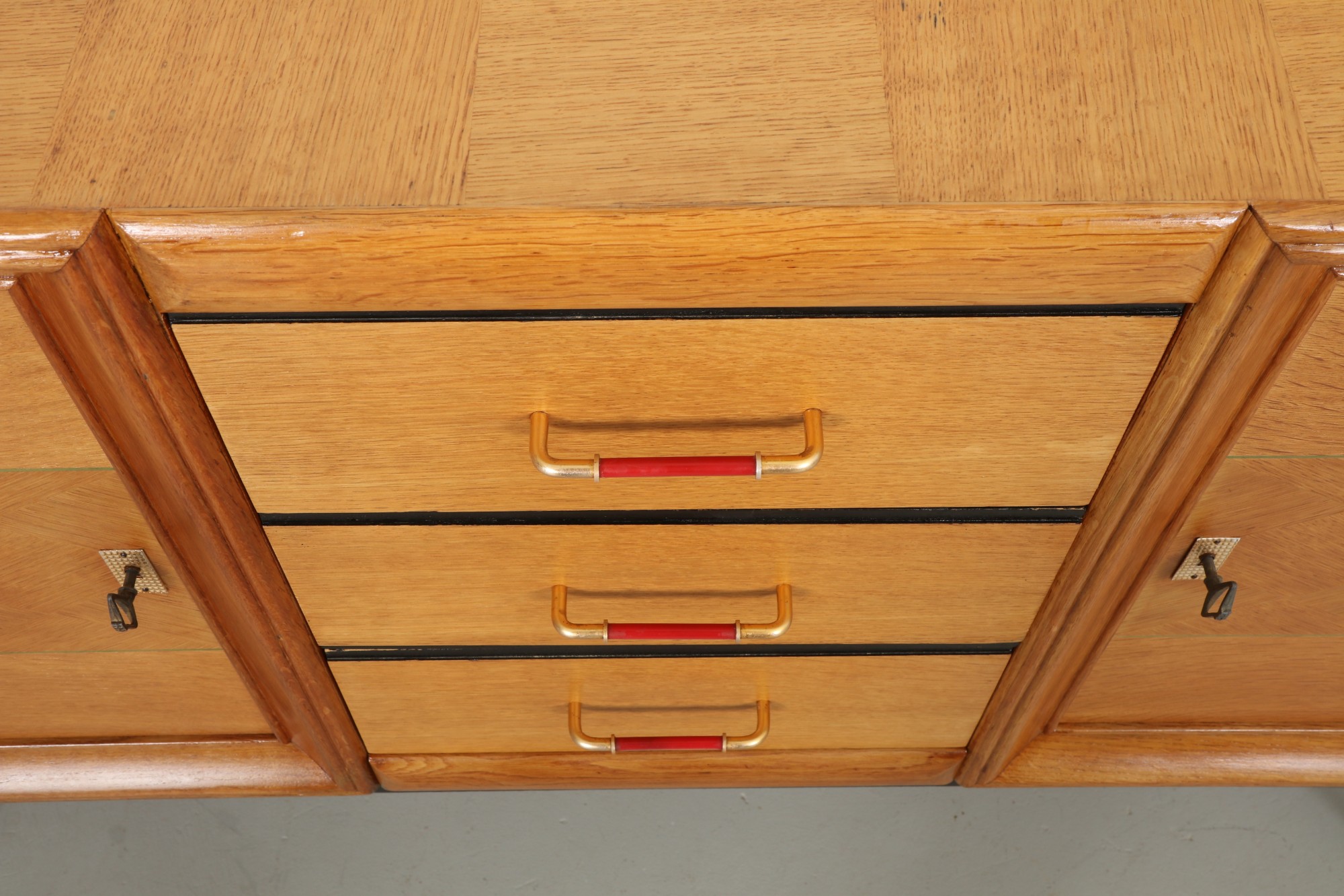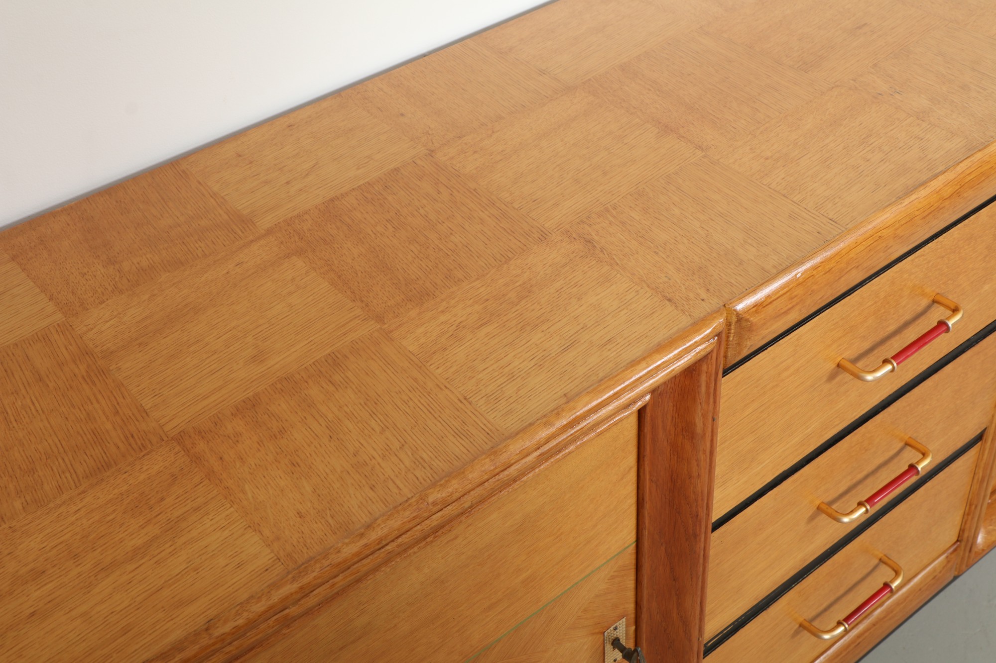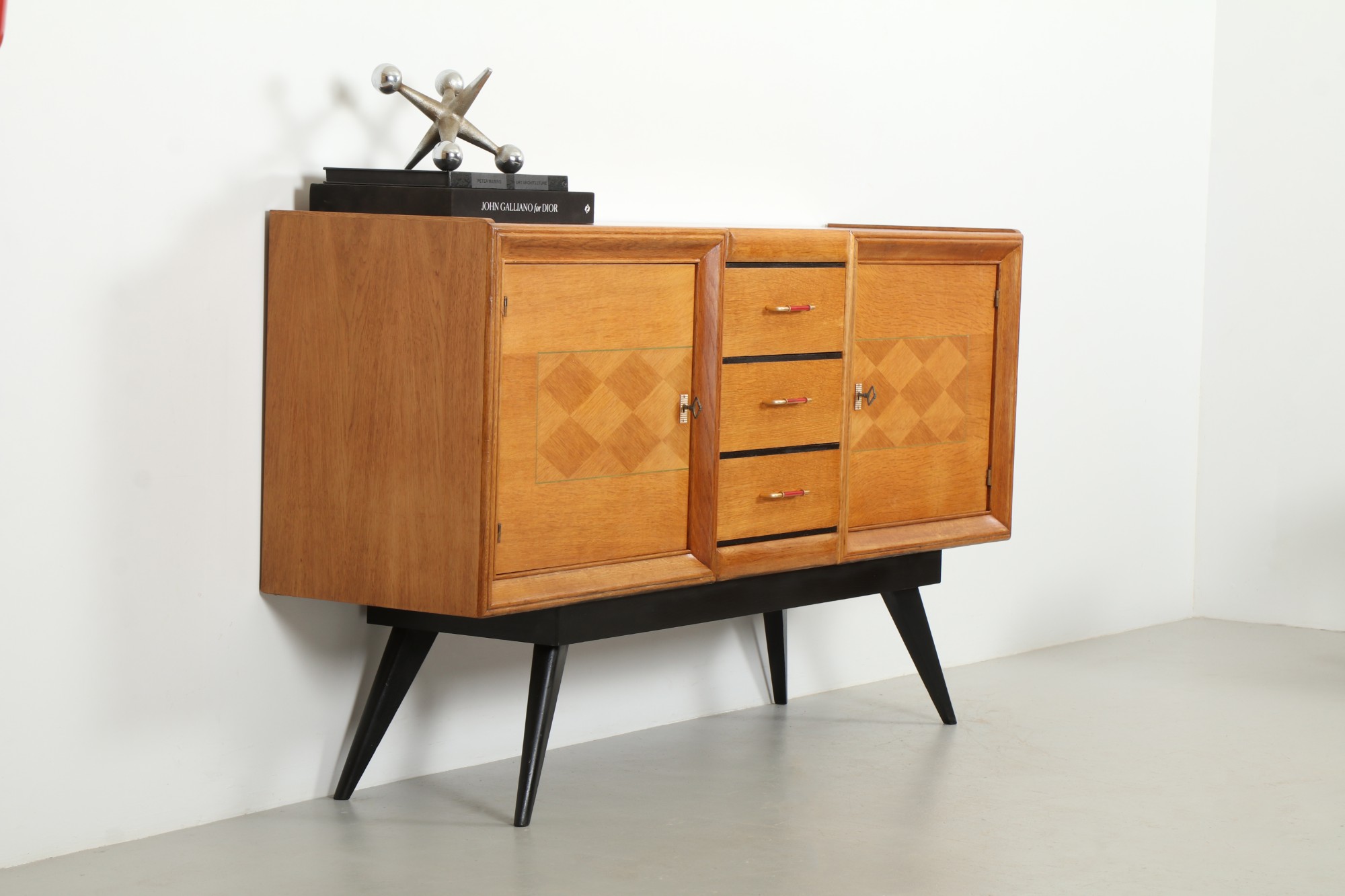 This graphic 1950s French sideboard is a showcase of bold decorative flourish. Highly splayed, ebonised legs anchor the piece, while a striking checkered veneer crowns the top and harlequin-patterned doors deliver rhythmic visual interest.