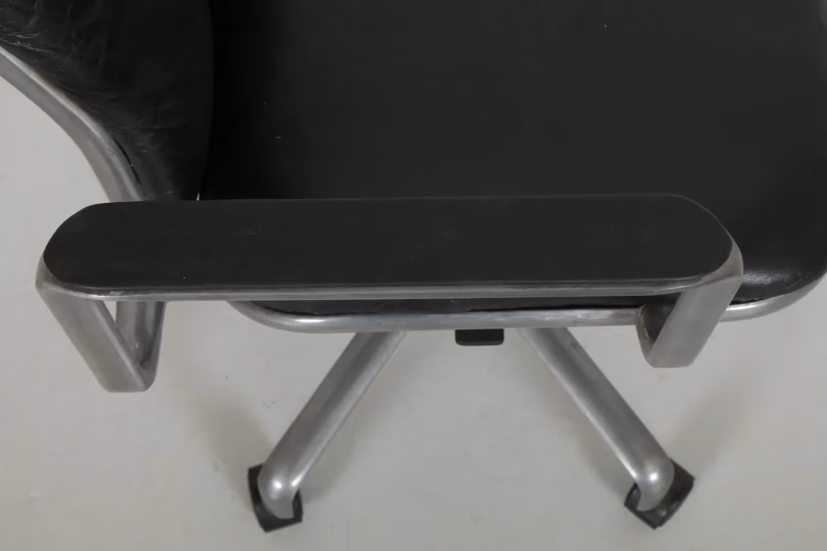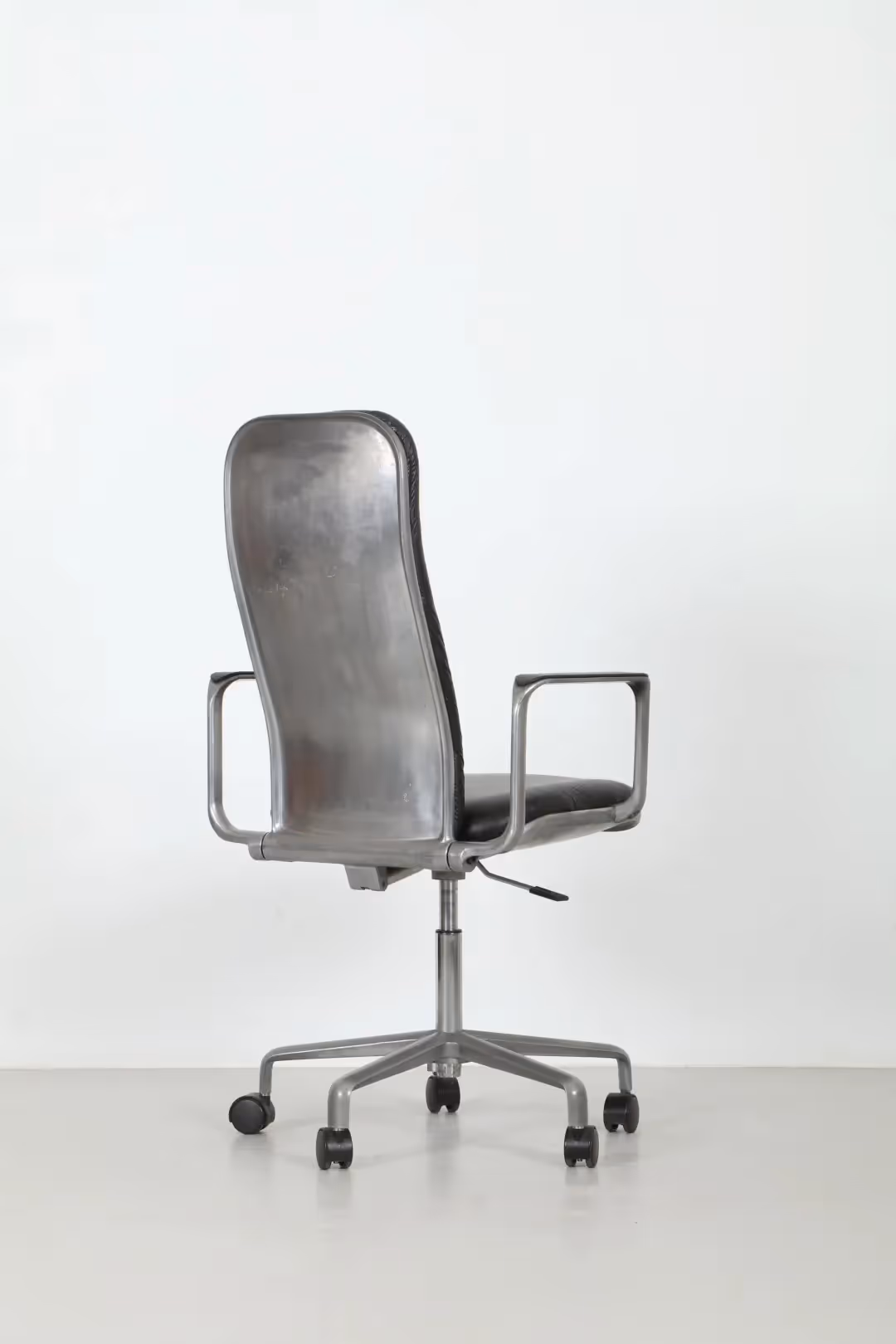 The form is based on detailed ergonomic studies of how people actually sit while working. The aluminium shell is cast to the contours of the body, with particular attention to the lower back. A slim line curved backrest and sculpted seat base are teamed with elegant, padded arm rests and a five point castor base.