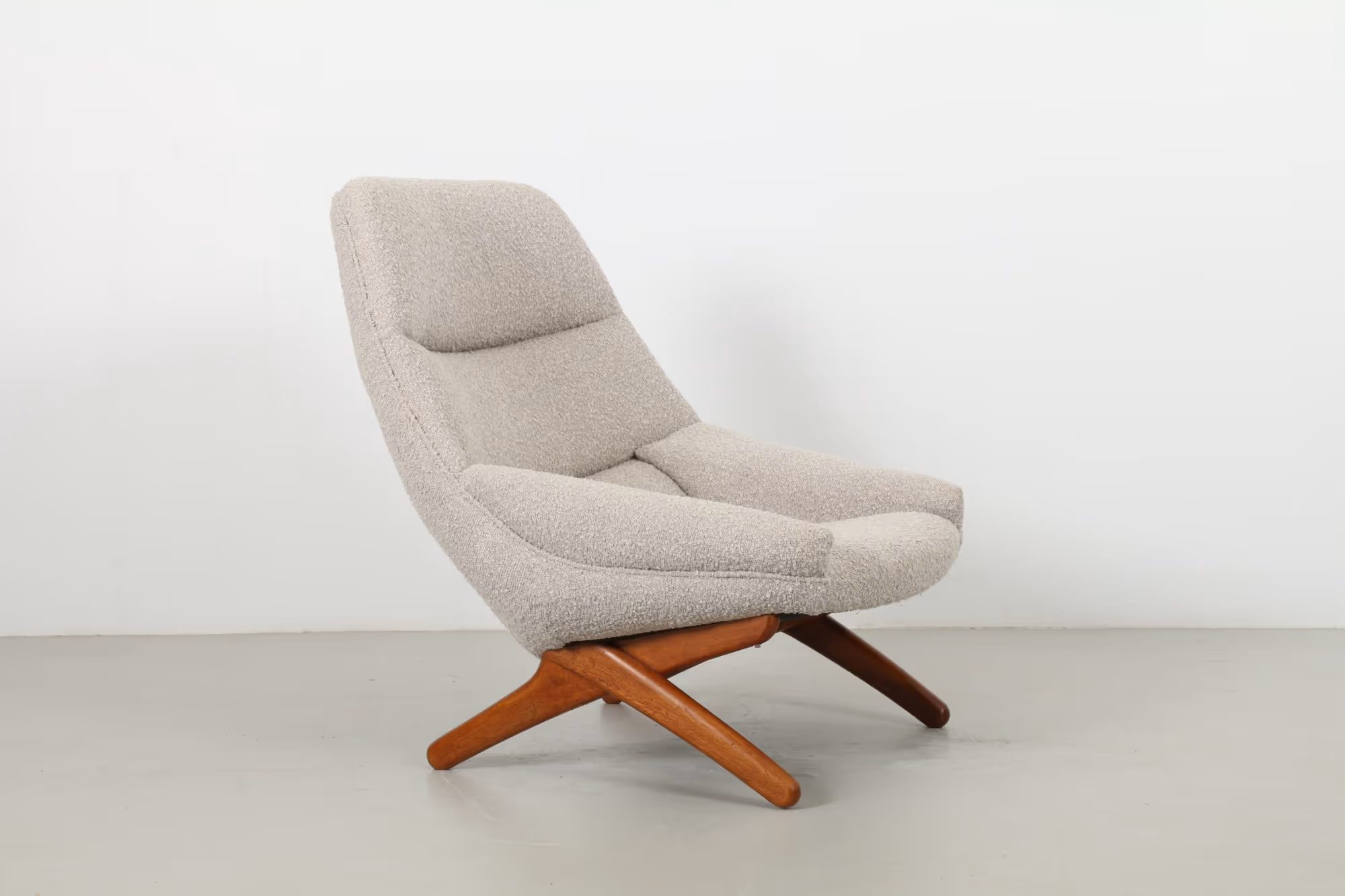 An iconic Danish lounge duo by Illum Wikkelso for Mikael Laursen, the 'ML91' armchair with matching ottoman showcases sculptural mid-century lines. A refined teak scissor-leg base frames a relaxed, reclined silhouette, balanced by contemporary bouclé upholstery that faithfully recreates the original design and inviting texture.