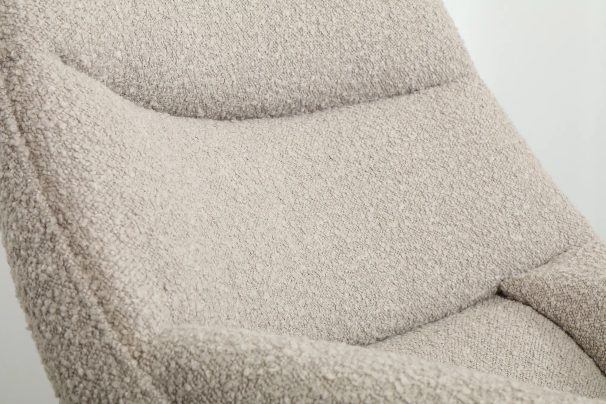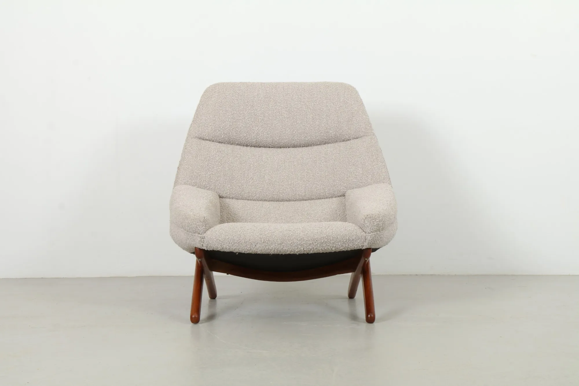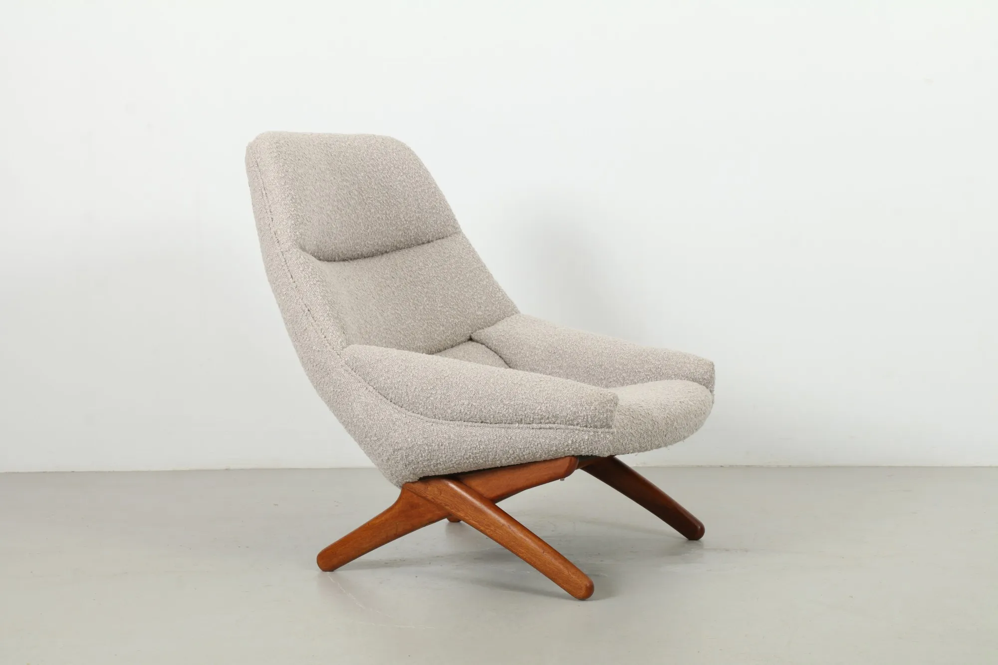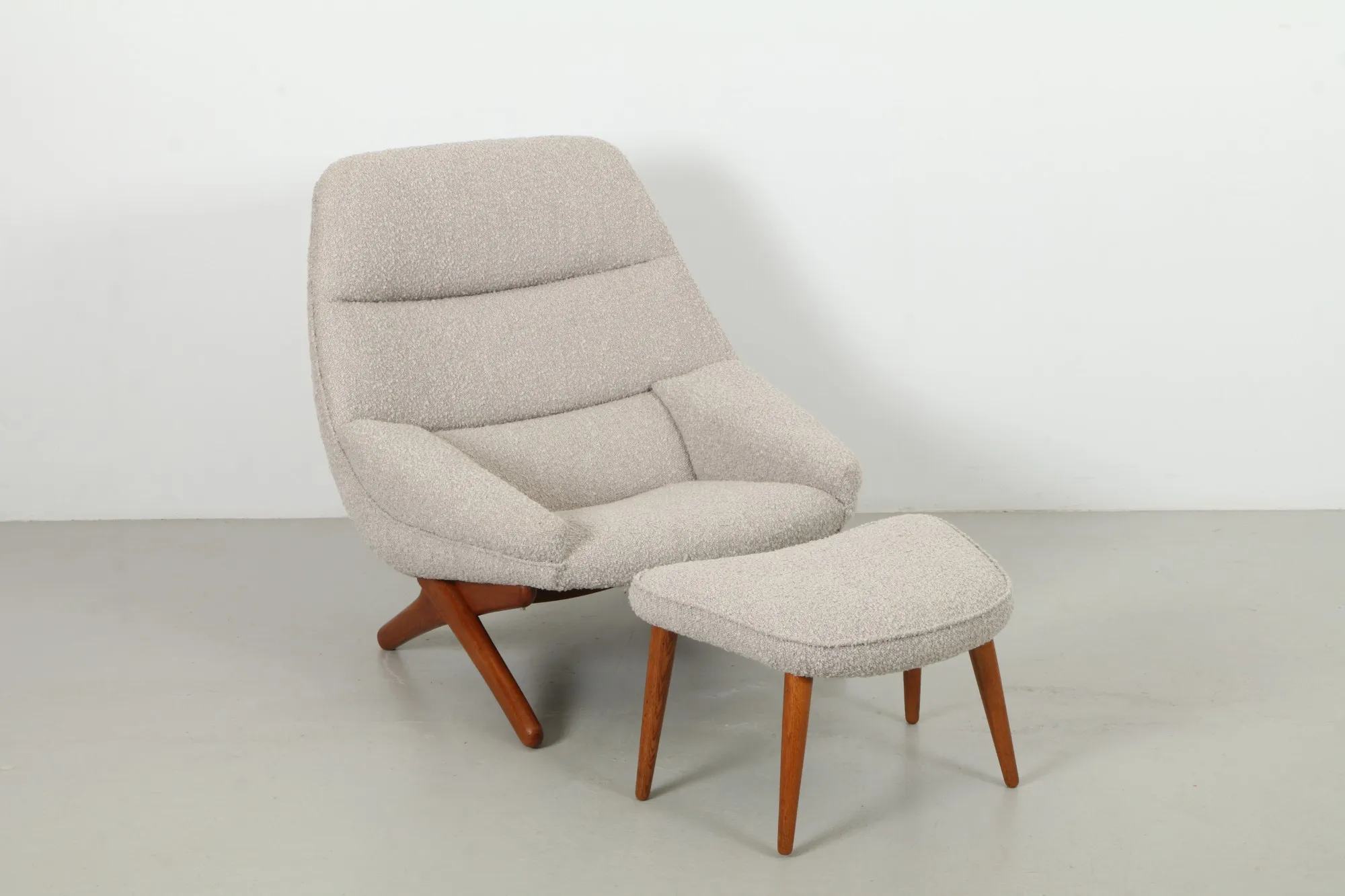 An iconic Danish lounge duo by Illum Wikkelsø for Mikael Laursen, the 'ML91' armchair with matching ottoman showcases sculptural mid-century lines. A refined teak scissor-leg base frames a relaxed, reclined silhouette, balanced by contemporary bouclé upholstery that faithfully recreates the original design and inviting texture.