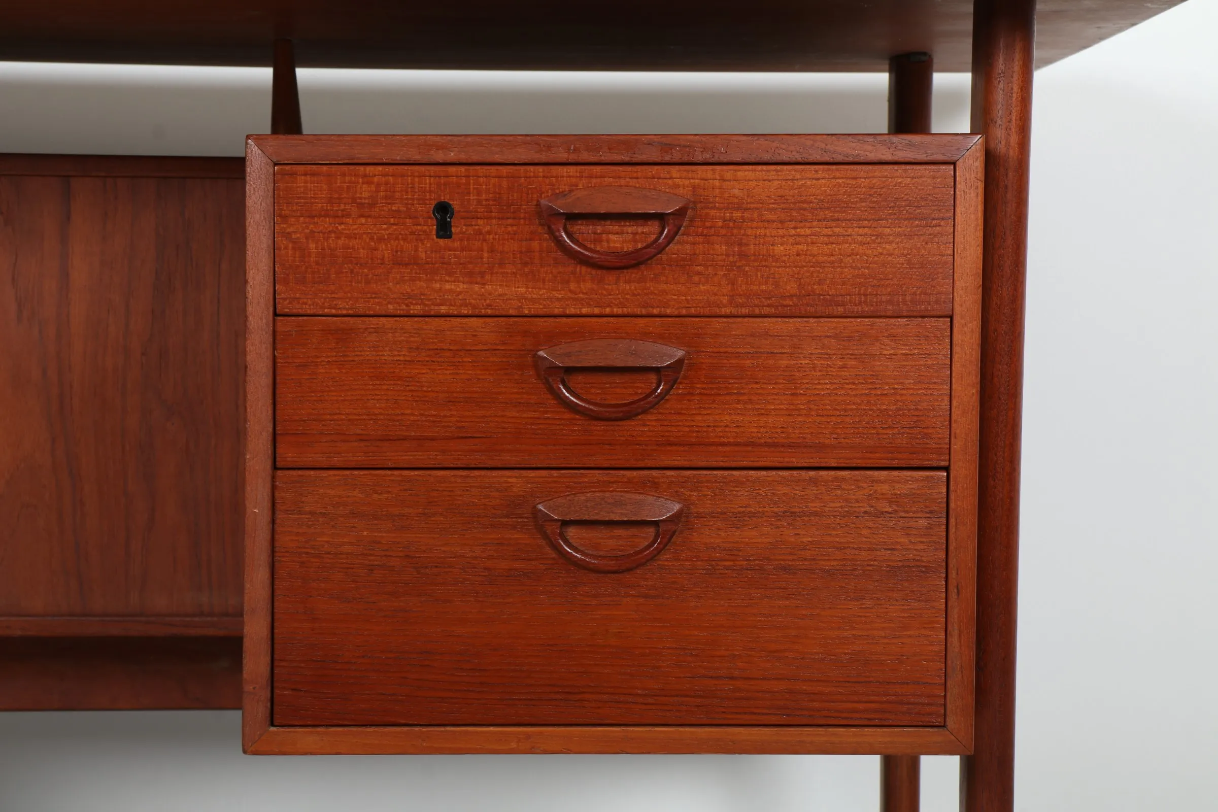 Celebrated Danish designer Kai Kristiansen began working for Feldballes Mobelfabrik in 1956 and this desk was the first of many successful designs. The linear form is lightened by the floating cabinets and finished by elegant tapered, solid teak legs.