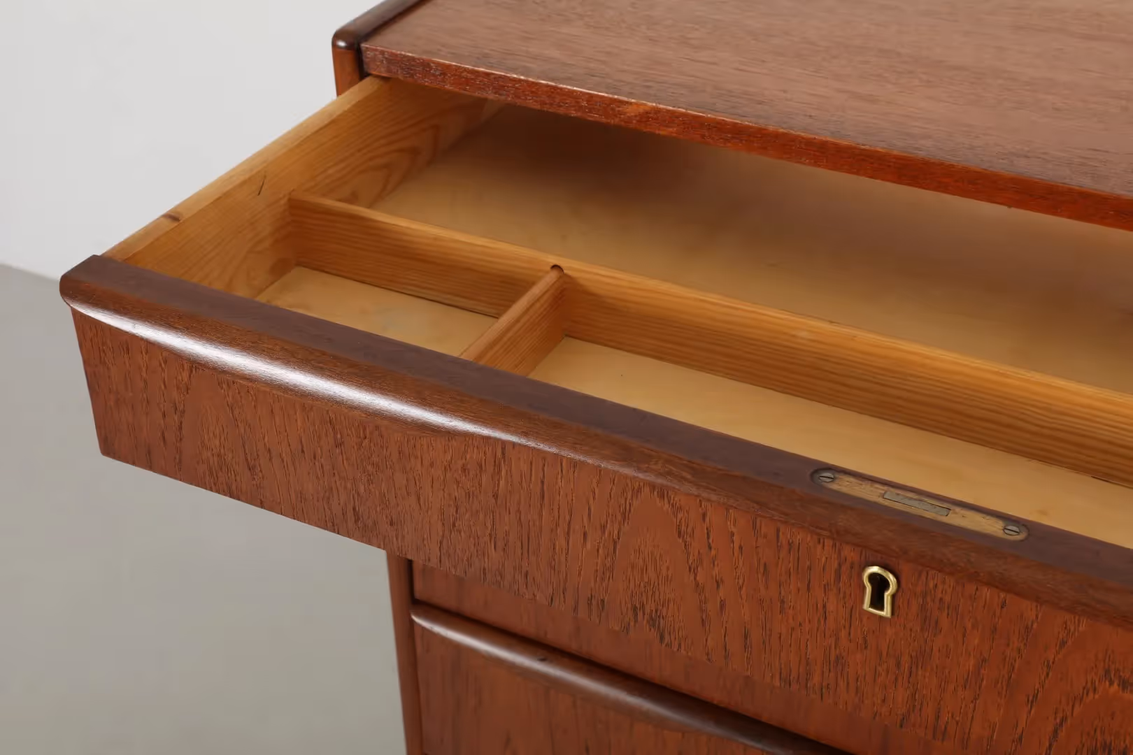 A refined example of Danish mid-century design, this six drawer chest showcases exceptional teak cabinetry and meticulous craftsmanship. The smooth, elongated knifeblade handles add a sculptural touch, while the stunning teak grain across the front creates a warm, inviting presence.
