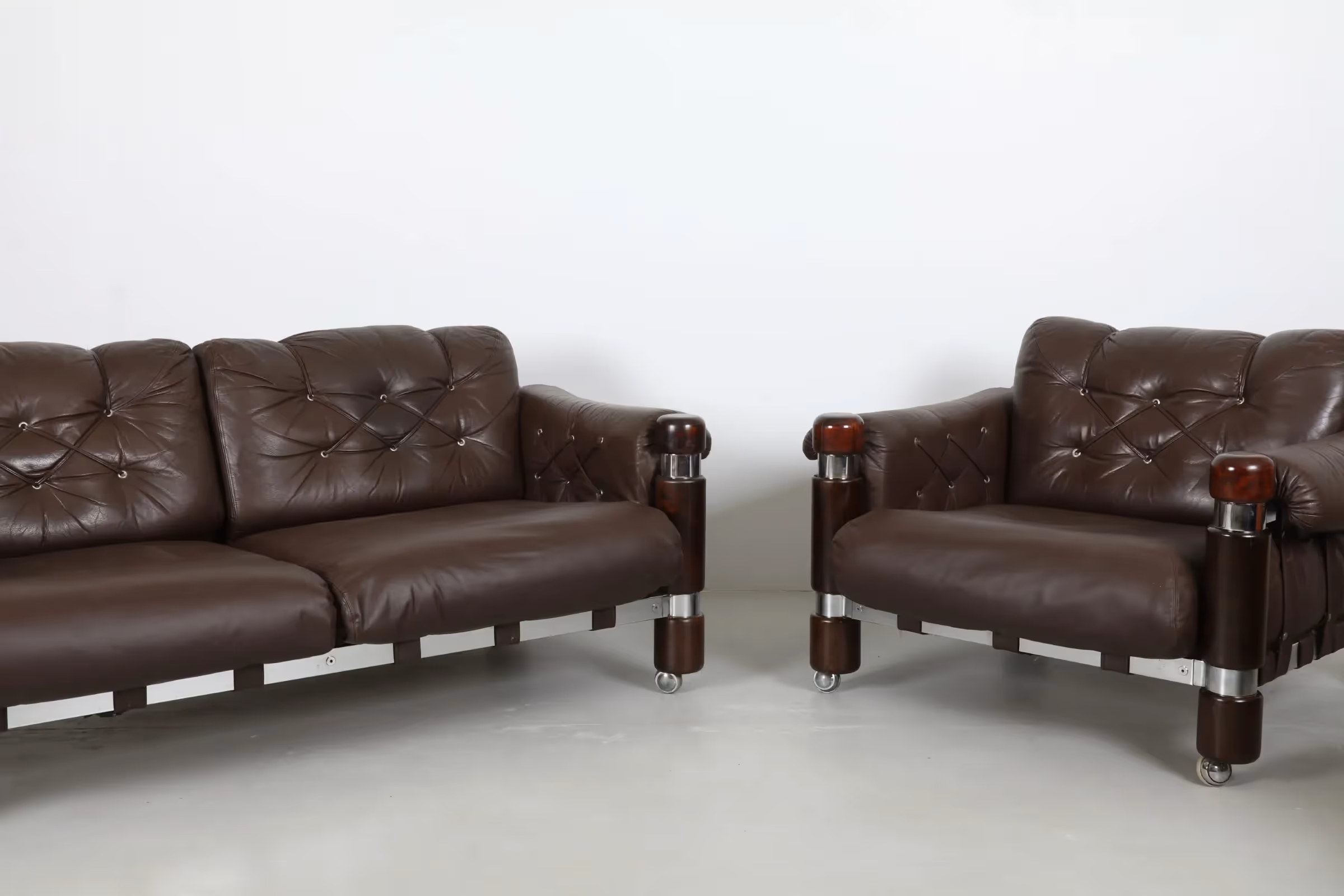 The bold and Impressive 'El Rancho' sofa was designed in the 1970s by the Finnish interior architect and visual artist Maija Aino Tuulikki Ruoslahti and produced by Kalustekiila of Finland. It is a rare and unmistakable design defined by substantial cylindrical legs in solid birch wood, combined with chrome crossbars, which support soft brown leather seats.