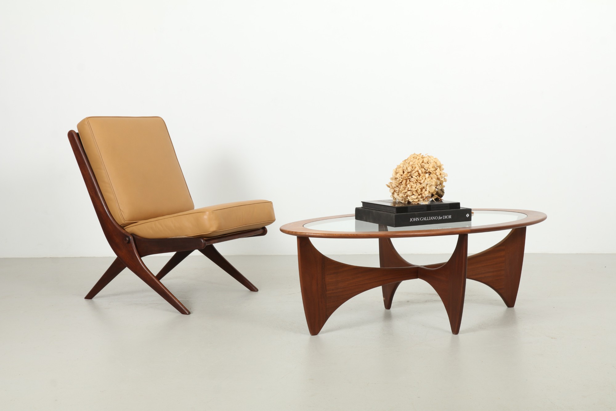 Rare and refined, this British-designed pair of ‘Scimitar’ lounge chairs showcases sculpted scissor frames with a striking, swooping profile. Thoughtfully engineered to fold, each chair delivers versatility without compromising the elegant, architectural silhouette.