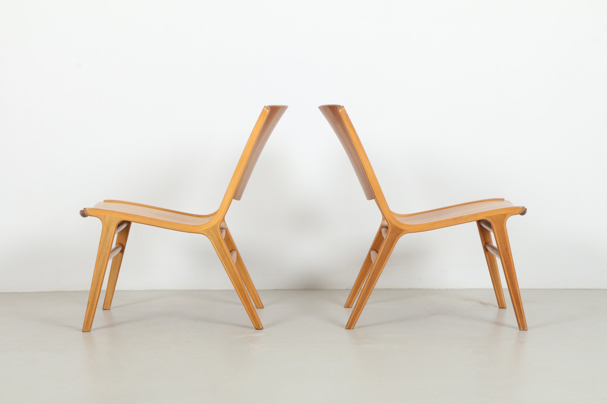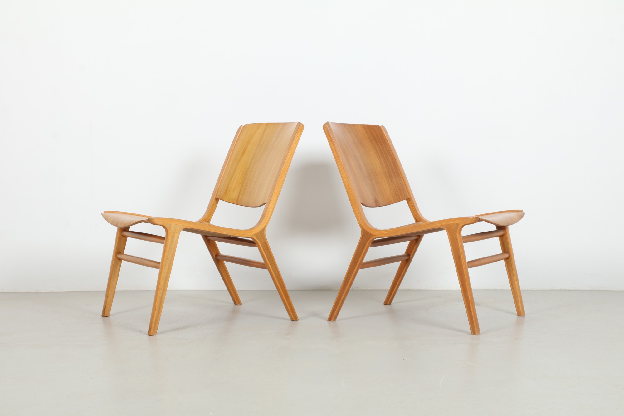 A striking pair of Hvidt & Molgaard-Nielsen 'Ax' lounge chairs by Fritz Hansen, these Danish icons, designed in 1947, showcase the innovative use of moulded plywood inspired by the form of a tennis racquet. The sculptural silhouettes and gently curved lines offer both comfort and visual appeal, embodying the essence of mid-century modern style.