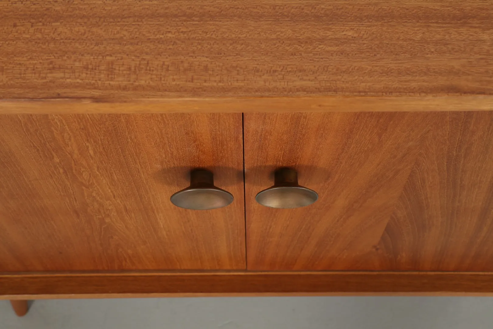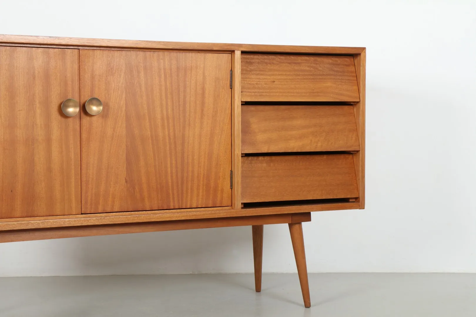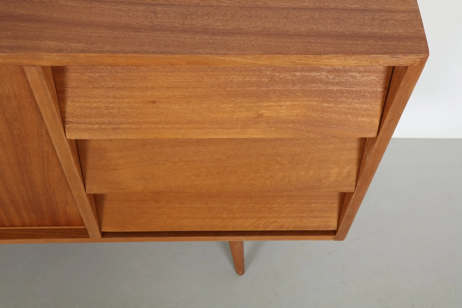 This rare mahogany sideboard is part of a larger range of furniture designed by Roukema. Each piece was crafted from solid timber with clean lines and a crisp lightness of form. A distinguishing feature of many of Roukema's designs are the pioneering outward splayed pin style legs which screw in and give the furniture an inspired lightness.
