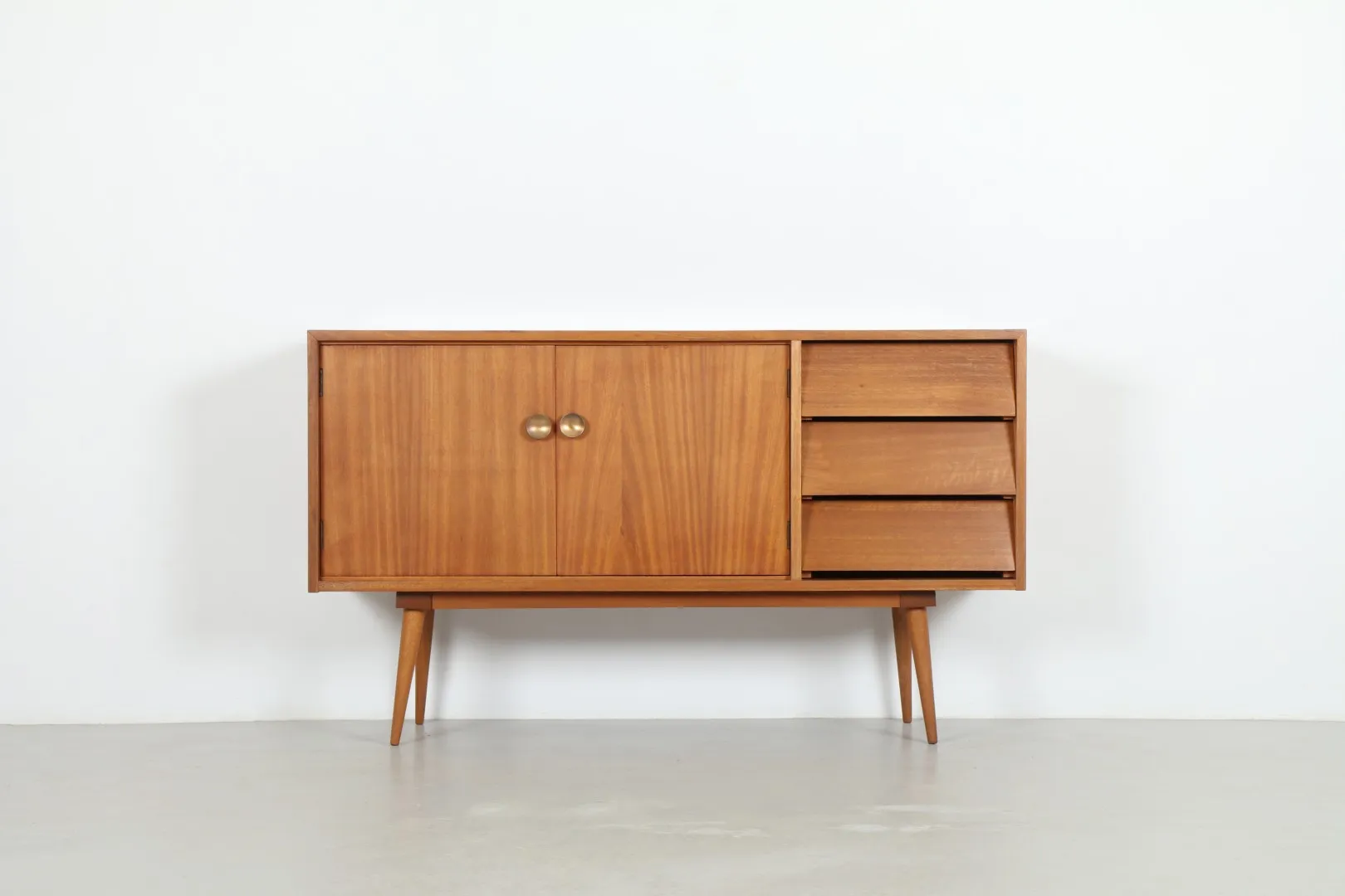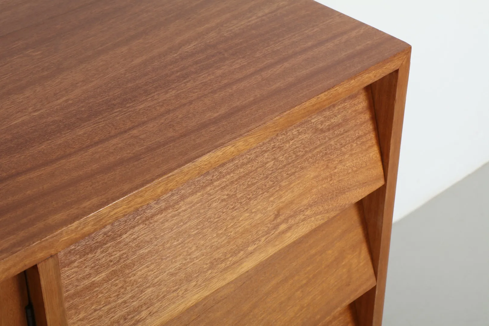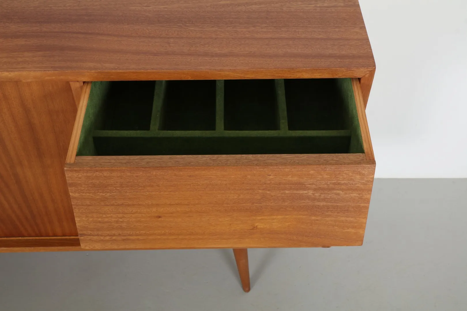 This rare mahogany sideboard is part of a larger range of furniture designed by Roukema. Each piece was crafted from solid timber with clean lines and a crisp lightness of form. A distinguishing feature of many of Roukema's designs are the pioneering outward splayed pin style legs which screw in and give the furniture an inspired lightness.