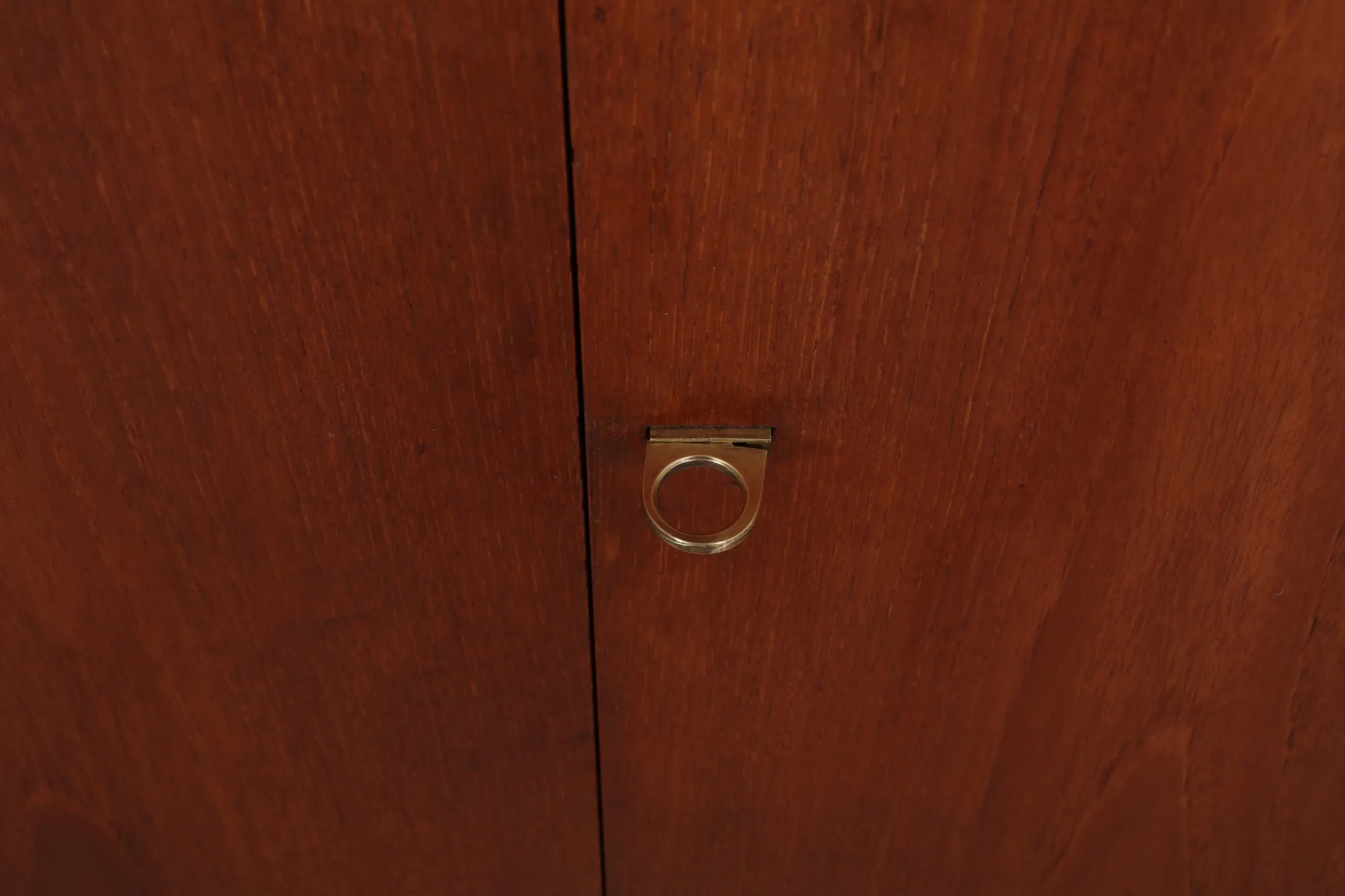 This refined upright cabinet by celebrated Danish designer Hans Wegner for Ry Mobler showcases richly grained teak with a radiant finish, balanced by a warm beech interior. Simple brass hardware subtly elevates the design, while tapered solid teak legs lift the form with poised elegance.