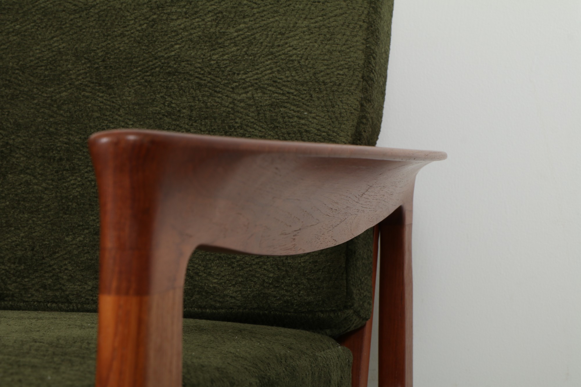 This refined yet substantial sofa by Sven Ellekaer for Danish maker Komfort is a highly memorable offering. It features a graphic, organic frame that is crafted from generous slabs of luminous teak. We love the sculptural, expressive curves of the armrests that create a bold statement for any modern living area.