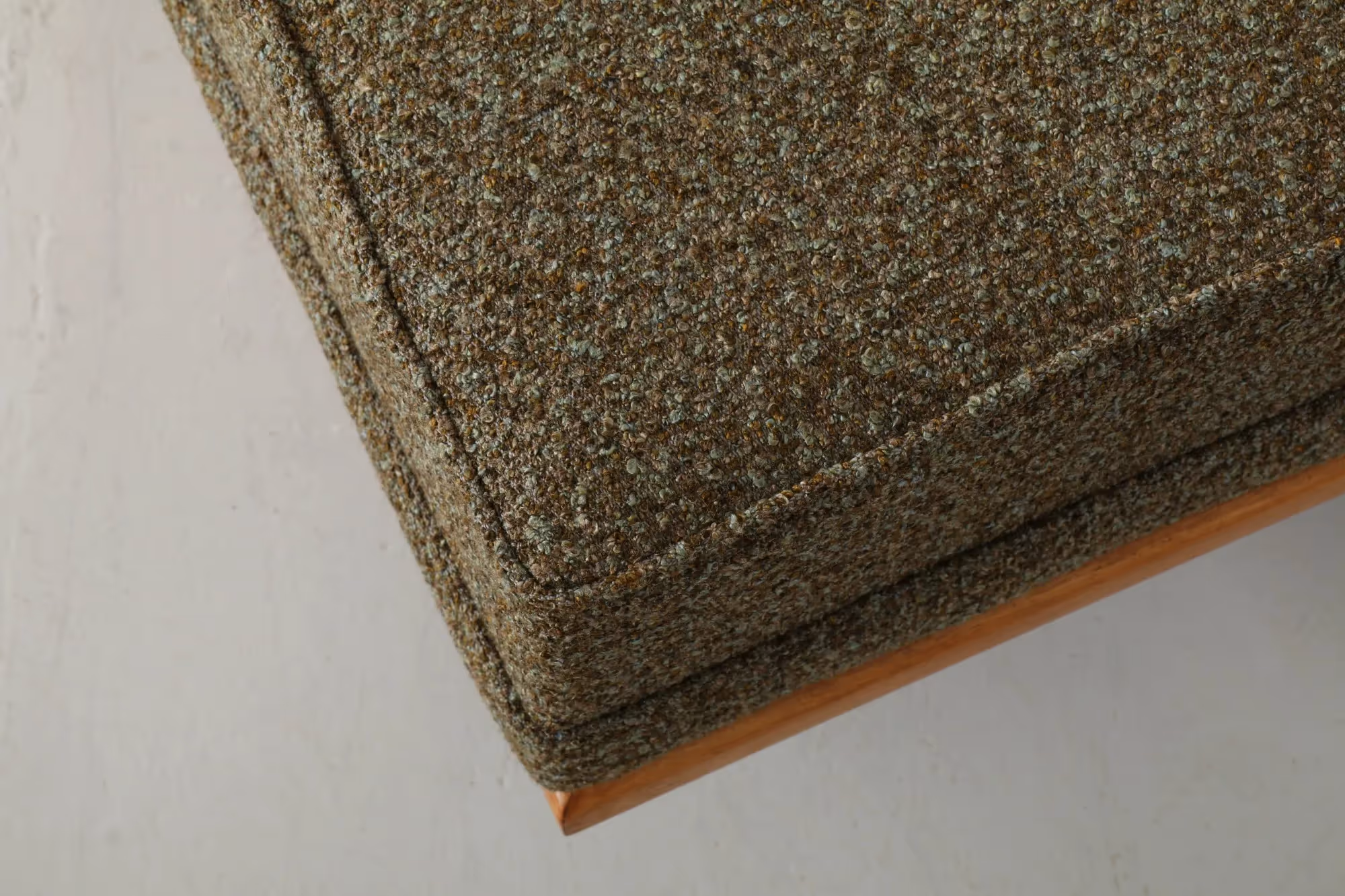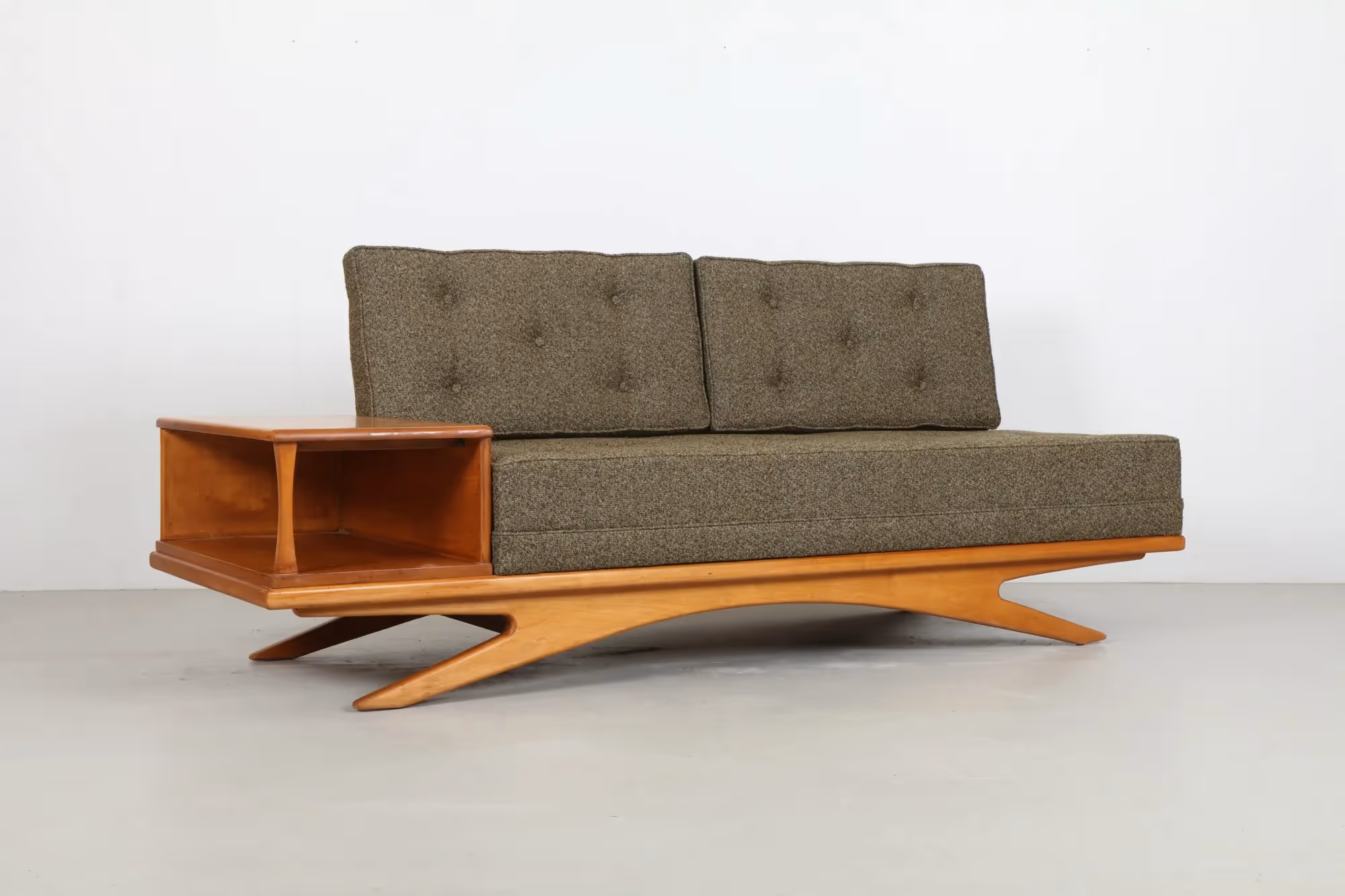 The rare and captivating Airest 'Sofarest' settee is a standout offering. The combination of clean lines, curvaceous legs and sharp upholstery make for a show stopping design that will turn heads in any contemporary interior. A handy side cabinet creates a lightness of form and ensures you can recline with a glass of your favourite within close reach.