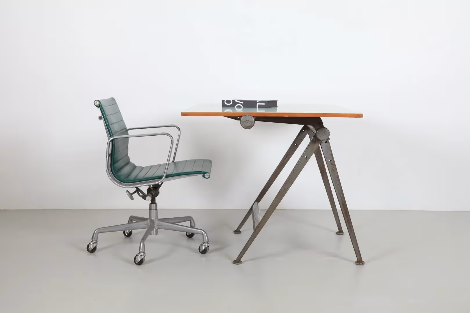 Designed with elegant, tapered legs and crafted from robust industrial materials, this desk blends functionality with sculptural form. Its clean lines and distinctive silhouette make it a standout piece for any creative workspace, reflecting Rietveld’s innovative approach to mid-century design.