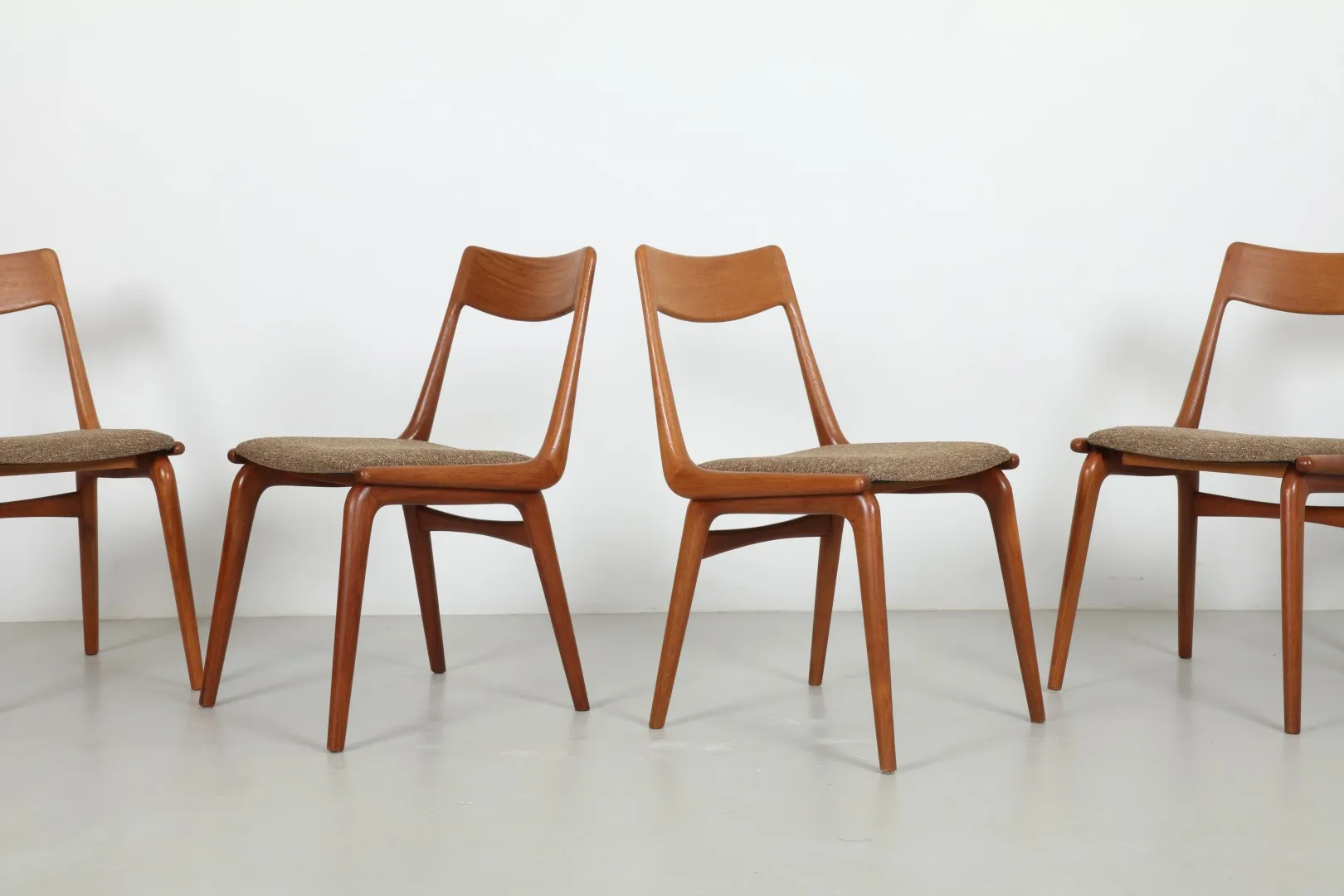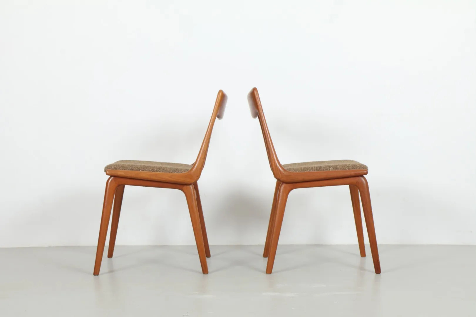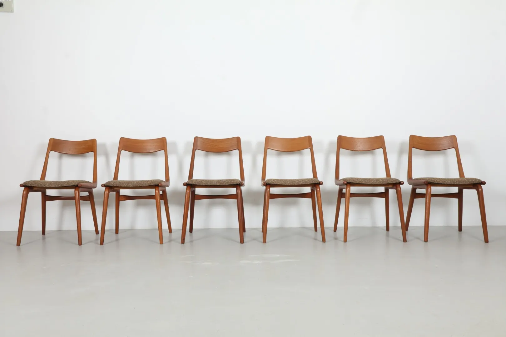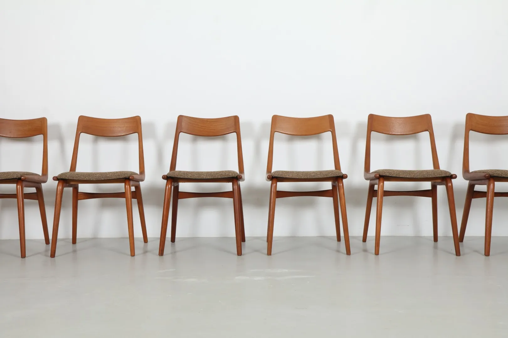 A striking set of six Alfred Christensen 'Boomerang' Model 370 dining chairs by Slagelse Mobelvaerk, crafted in rich teak. These refined mid-century pieces showcase sculptural boomerang-shaped frames and gently reclined backs, offering both comfort and visual appeal.