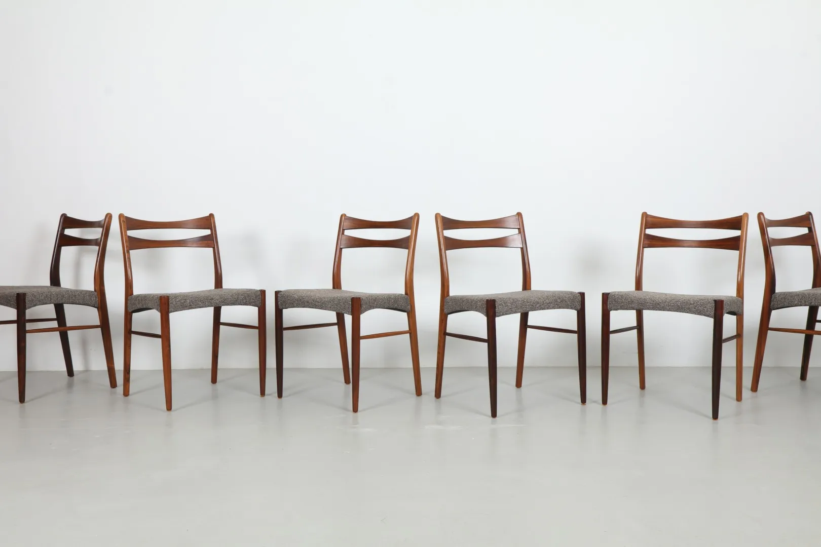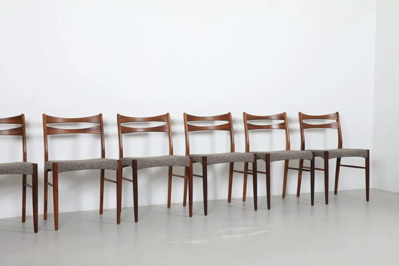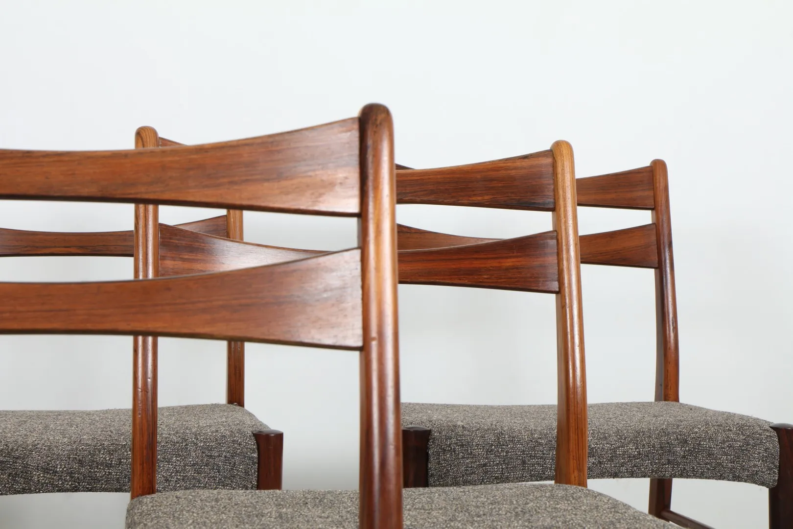 A striking set of six rosewood dining chairs, attributed to Arne Wahl Iversen, showcasing refined Danish craftsmanship. Each chair features sculpted lines, elegant joinery, and beautifully grained rosewood frames, reminiscent of Iversen’s celebrated ‘GS60’ design.