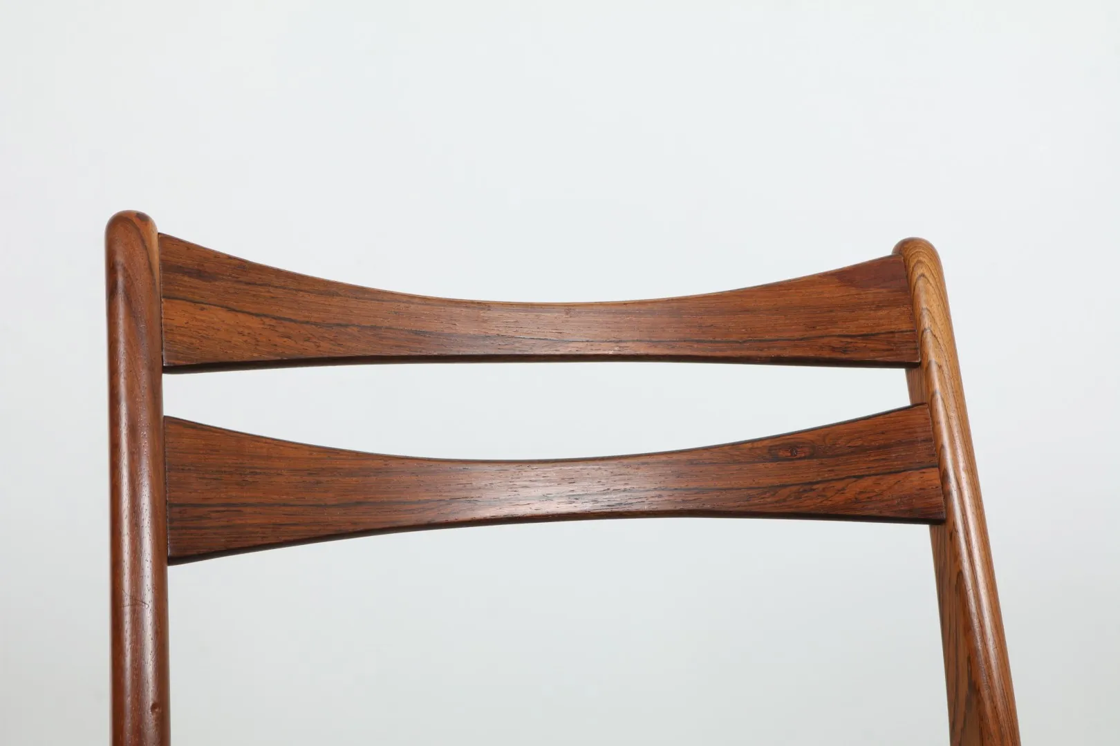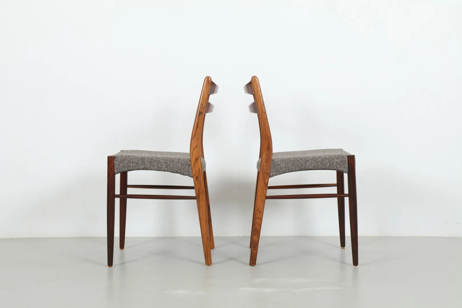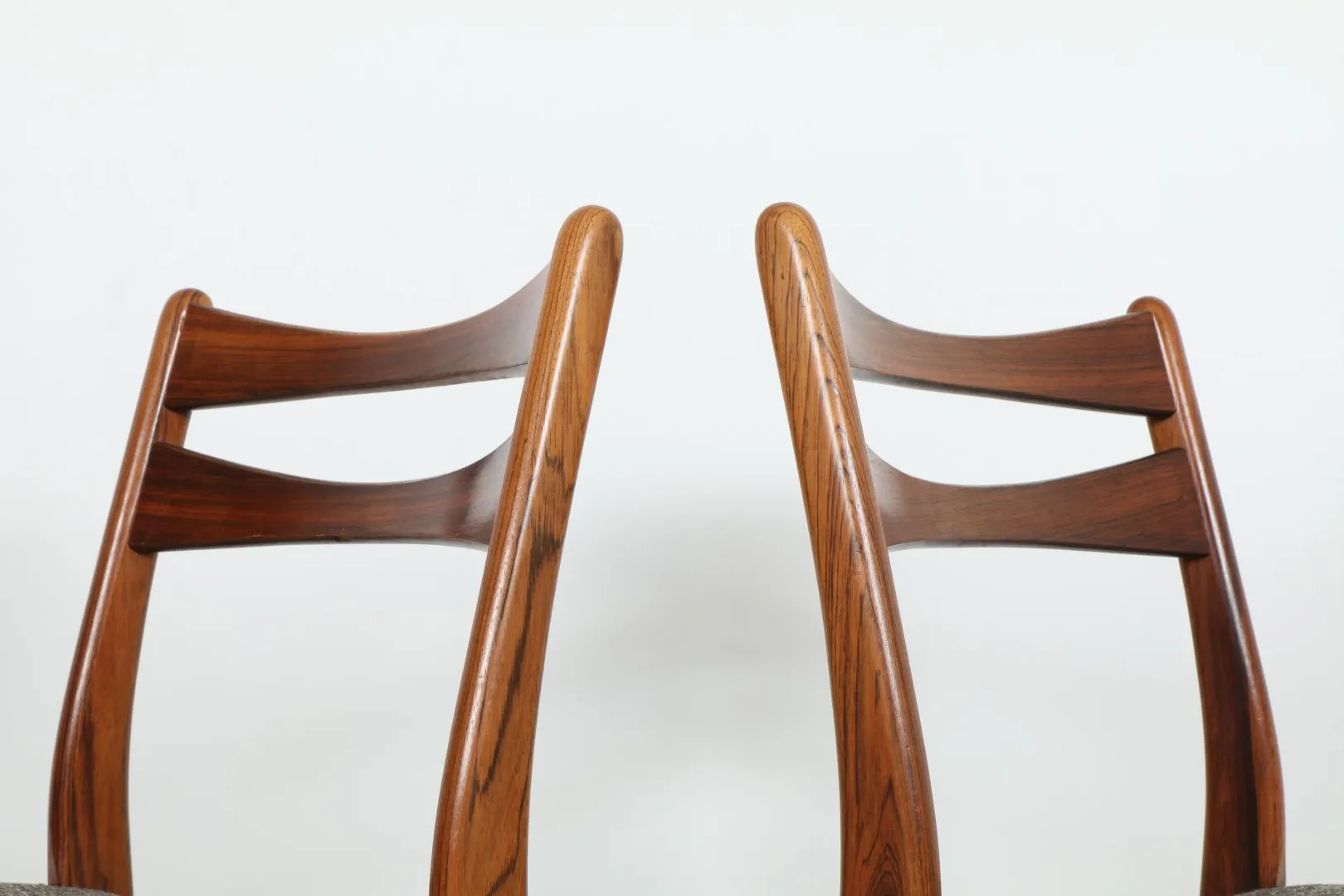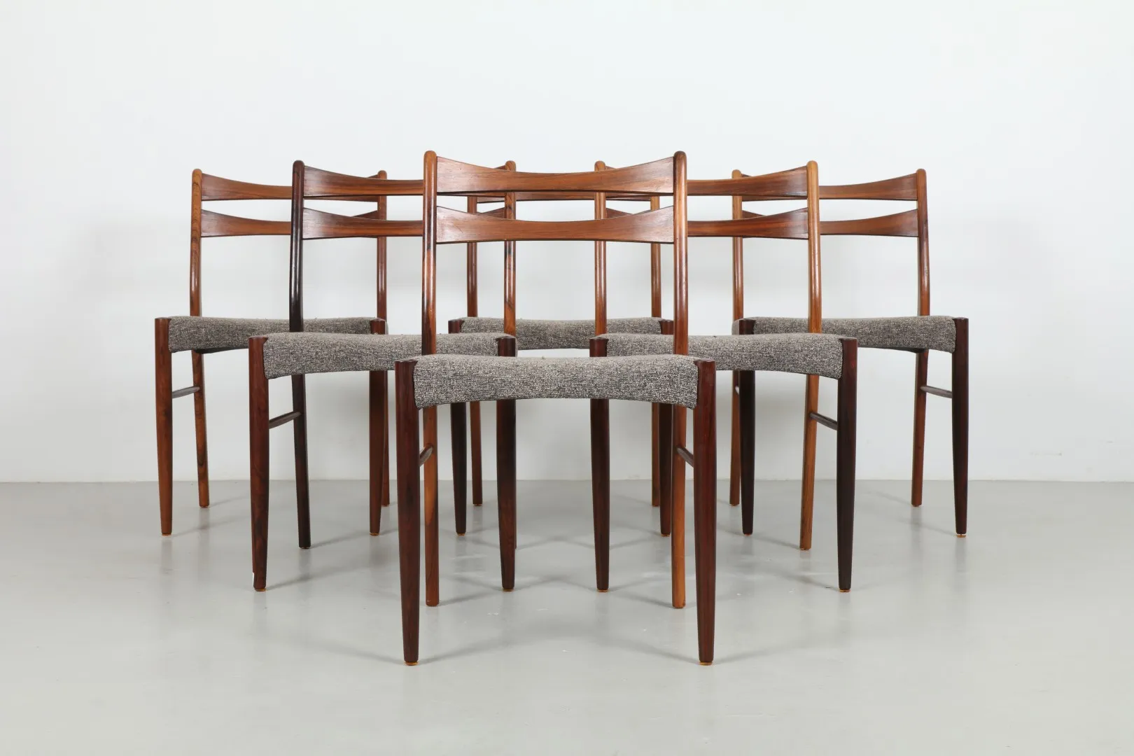 A striking set of six rosewood dining chairs, attributed to Arne Wahl Iversen, showcasing refined Danish craftsmanship. Each chair features sculpted lines, elegant joinery, and beautifully grained rosewood frames, reminiscent of Iversen’s celebrated ‘GS60’ design.