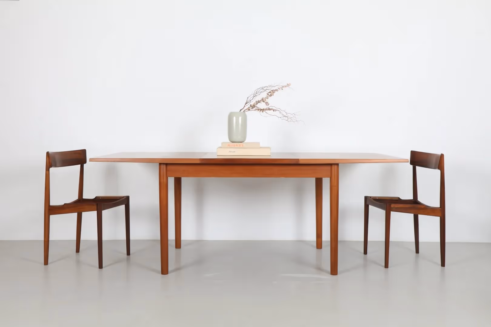 A refined example of British mid-century design, the Sleek David Walker Teak Dining Table by Dalescraft combines functionality with understated elegance. Crafted from rich teak, this extension table features clean lines and gently tapered legs, offering a timeless silhouette that complements any interior.