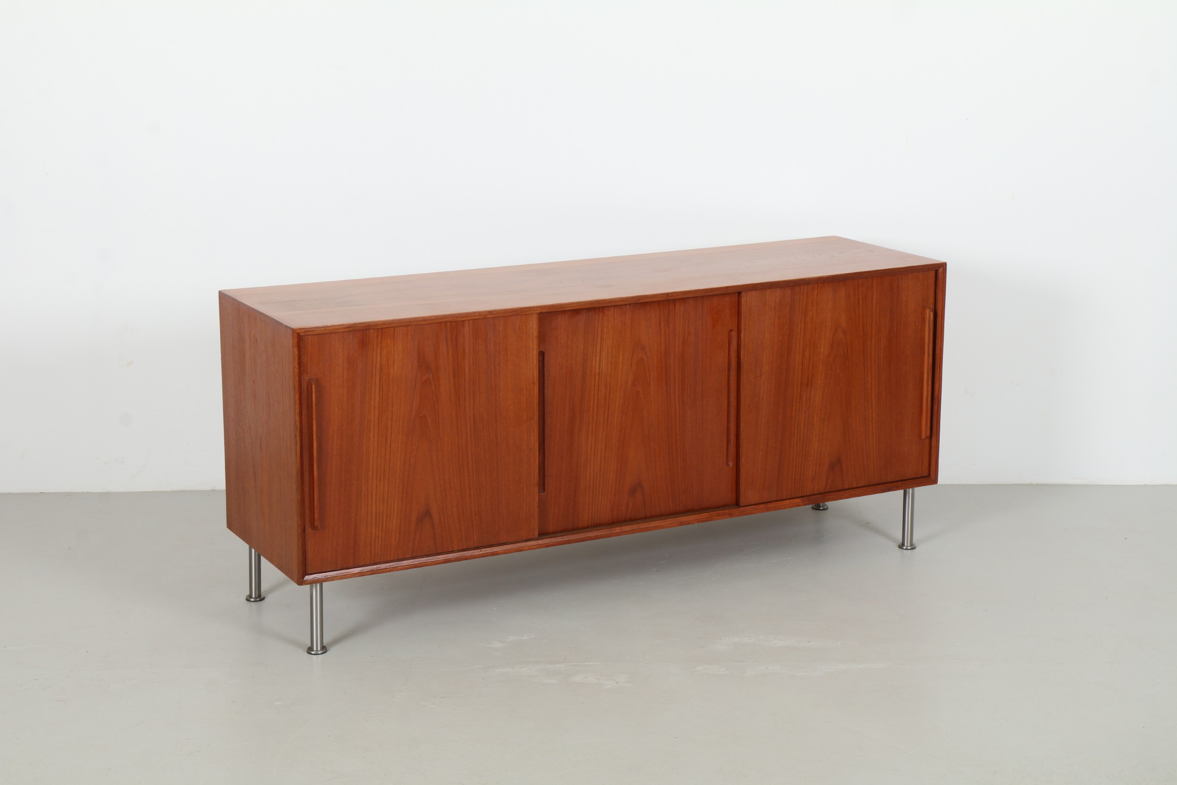 Clean and linear, this stunning teak cabinet is given a contemporary touch with slim steel legs to add lightness of form.