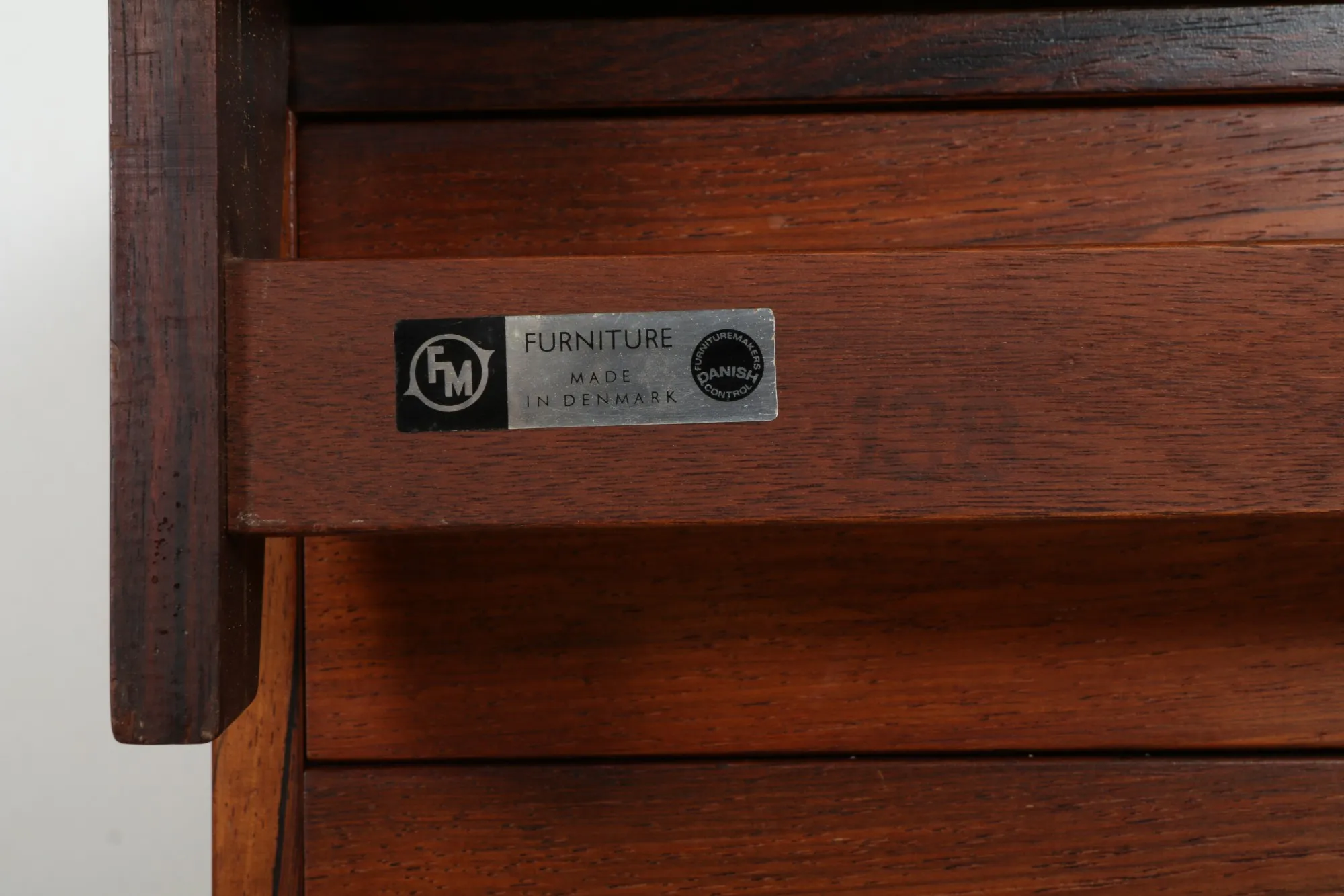 The 'Model FM' is an iconic modular wall unit by Danish master Kai Kristiansen for Feldballes Møbelfabrik, crafted in richly figured rosewood. Clean, architectural lines frame beautifully detailed cabinetry with adjustable shelves and versatile storage to tailor display and function with ease.