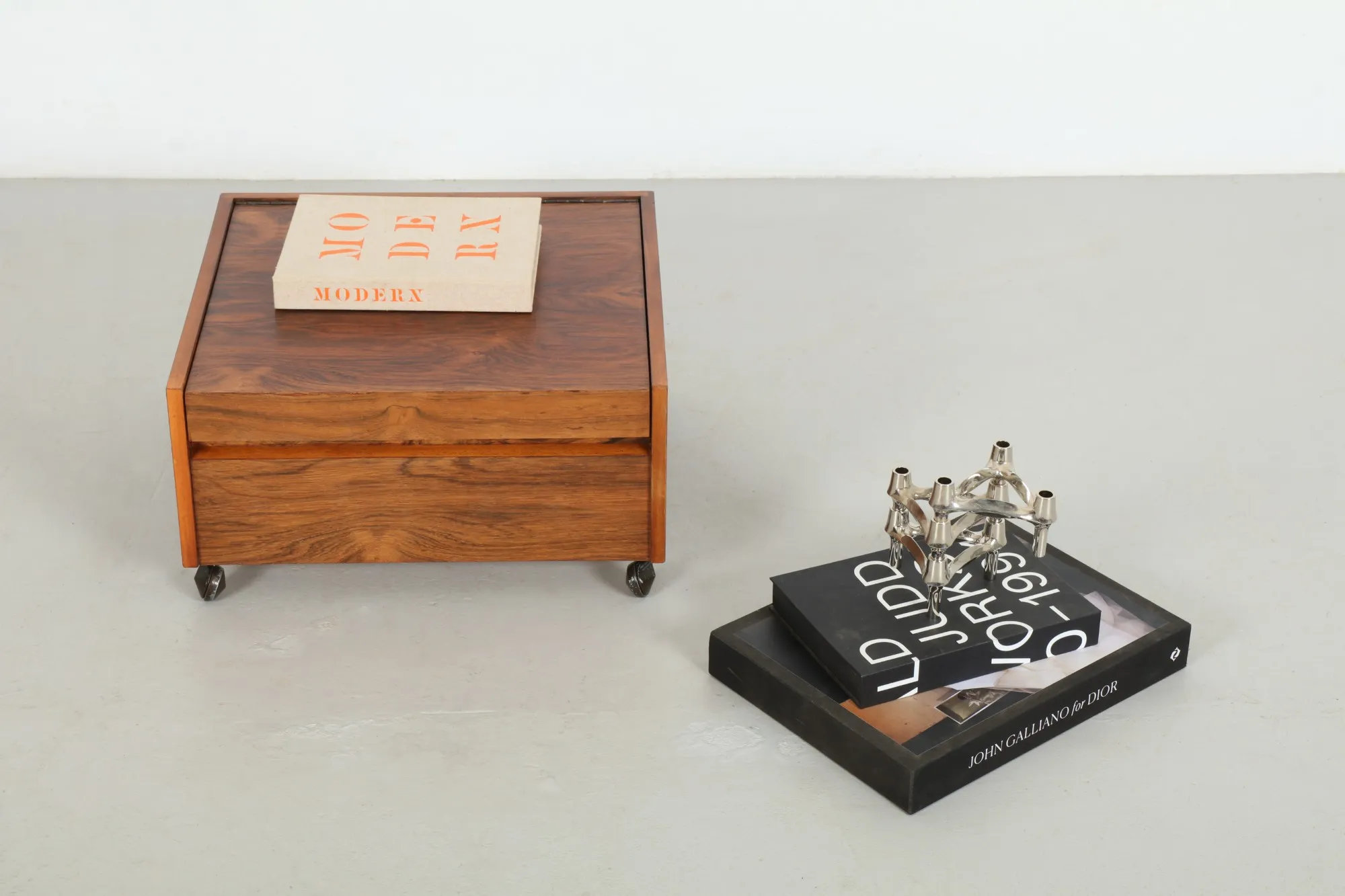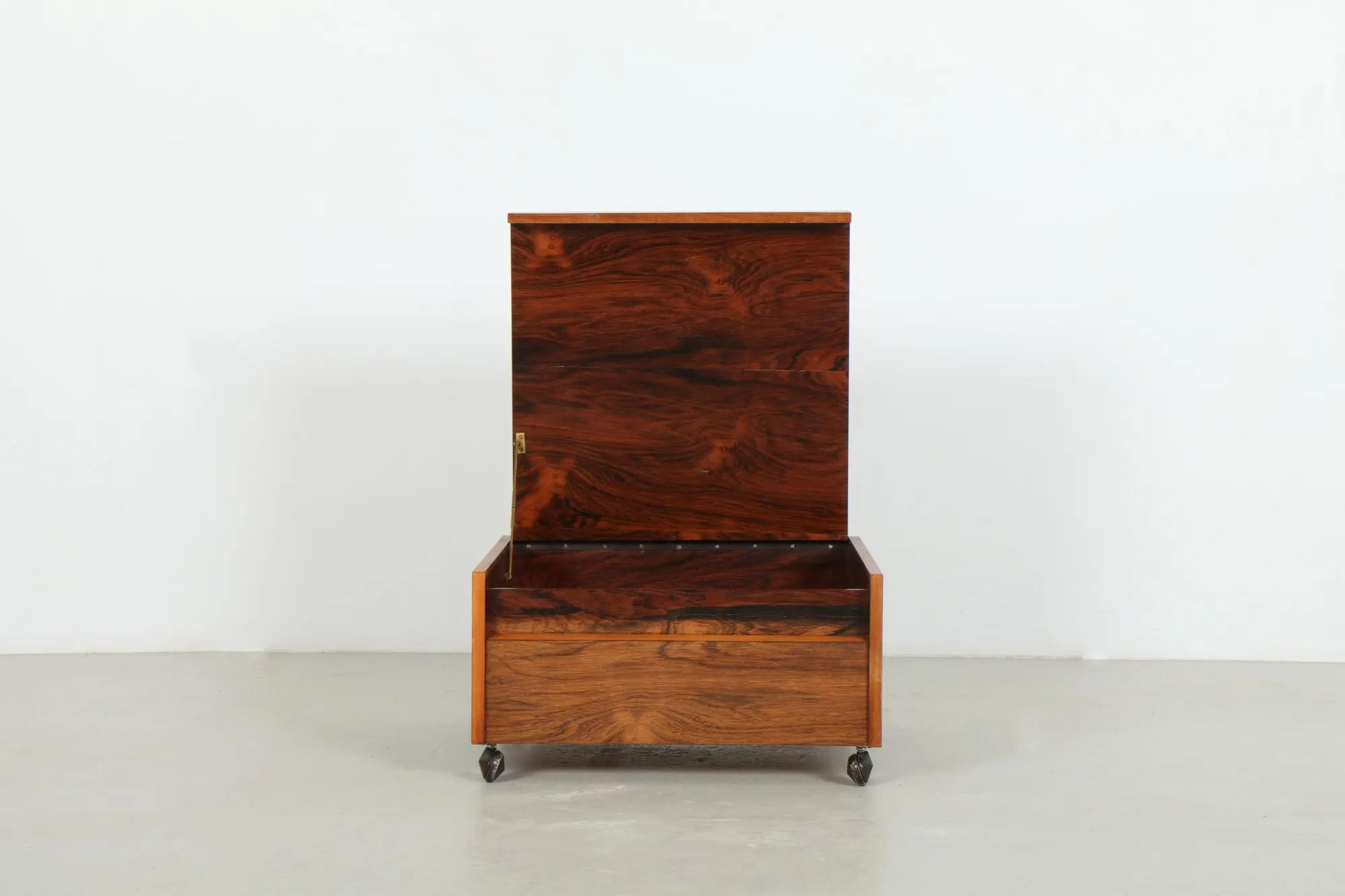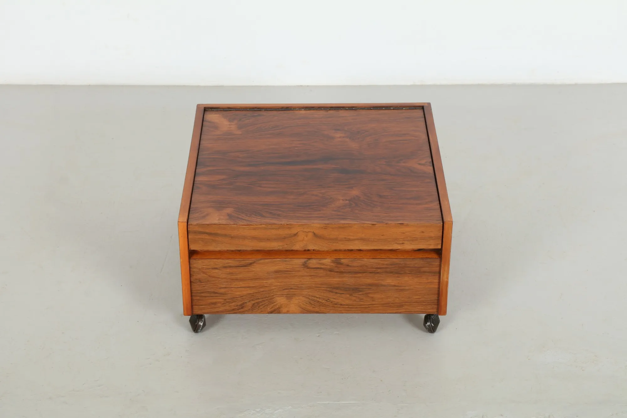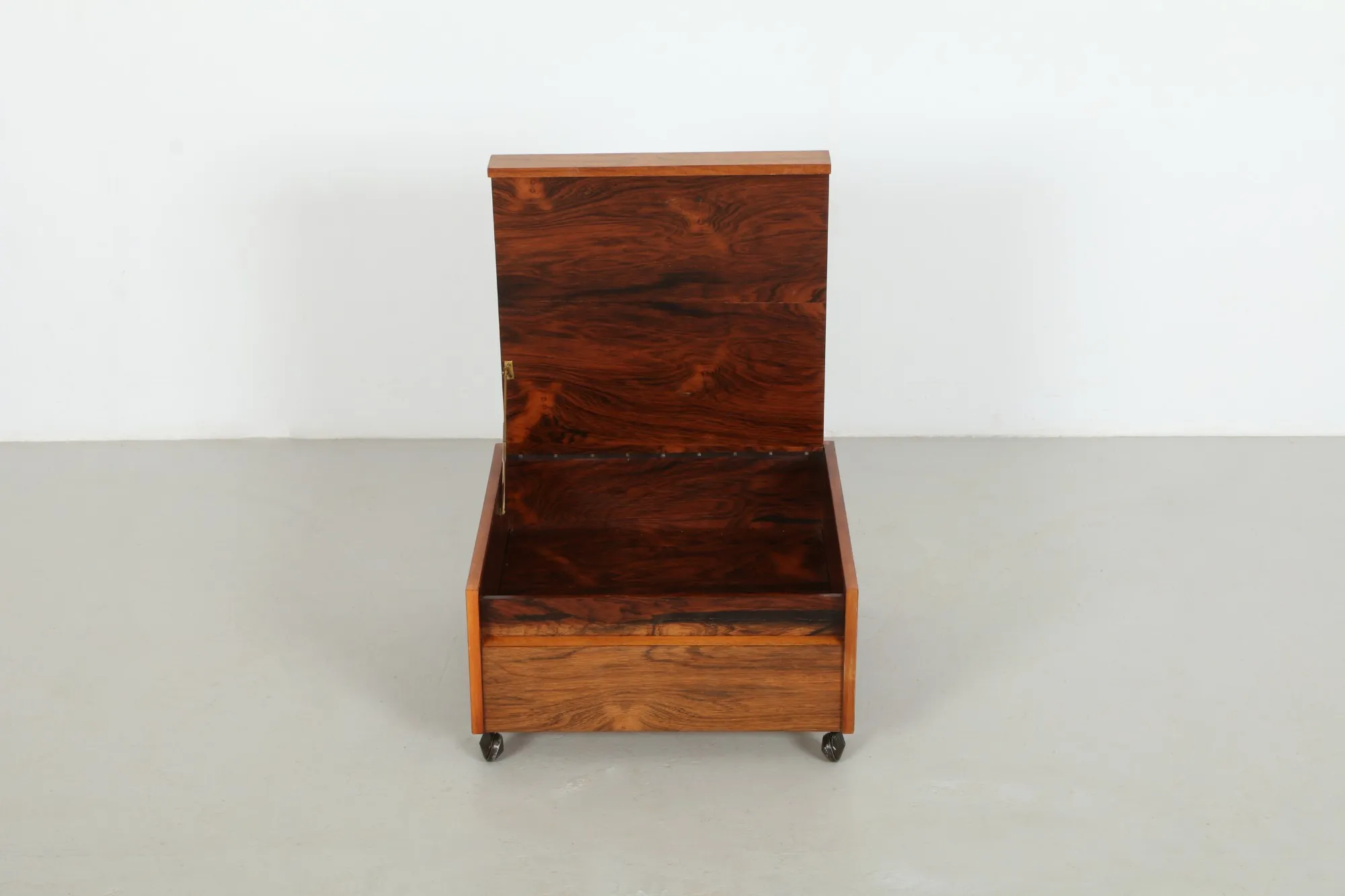 A striking example of mid-century design, this low line side table offers versatile storage with a compact magazine cube and a clever fold-up lid. Crafted from rich rosewood, it sits gracefully on smooth castor wheels for effortless mobility. Perfect as a stylish bedside companion or a functional lounge accent, this piece combines timeless elegance with practical appeal, making it an ideal addition to any modern interior.